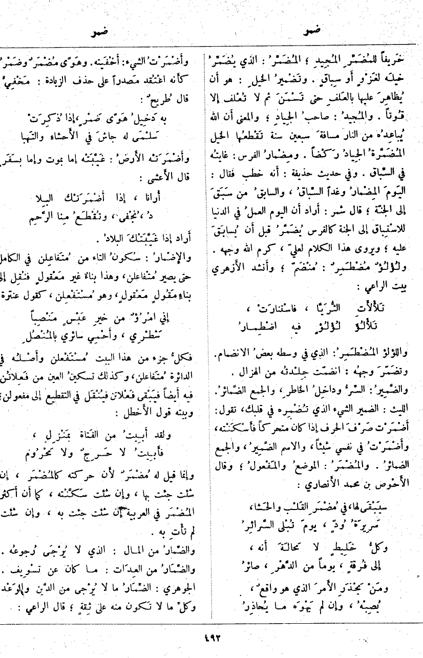 وَاللُّؤْلُؤُ المُضْطَمِرُ: الَّذِي فِي وَسَطِهِ بعضُ الِانْضِمَامِ. وتَضَمّرَ وجهُه: انْضَمَّتْ جِلْدتُه مِنَ الْهُزَالِ. والضَّمِيرُ: السِّرُّ وداخِلُ الخاطرِ، وَالْجَمْعُ الضَّمائرُ. اللَّيْثُ: الضَّمِيرُ الشَّيْءُ الَّذِي تُضْمِره فِي قَلْبِكَ، تَقُولُ: أَضْمَرْت صَرْفَ الْحَرْفِ إِذا كَانَ مُتَحَرِّكًا فأَسْكَنْته، وأَضْمَرْتُ فِي نَفْسِي شيئاً، والاسم الضَّمِيرُ، وَالْجَمْعُ الضَّمَائِرُ. والمُضْمَرُ: الموضعُ والمَفْعولُ؛ وَقَالَ الأَحْوص بْنُ مُحَمَّدٍ الأَنصاري: