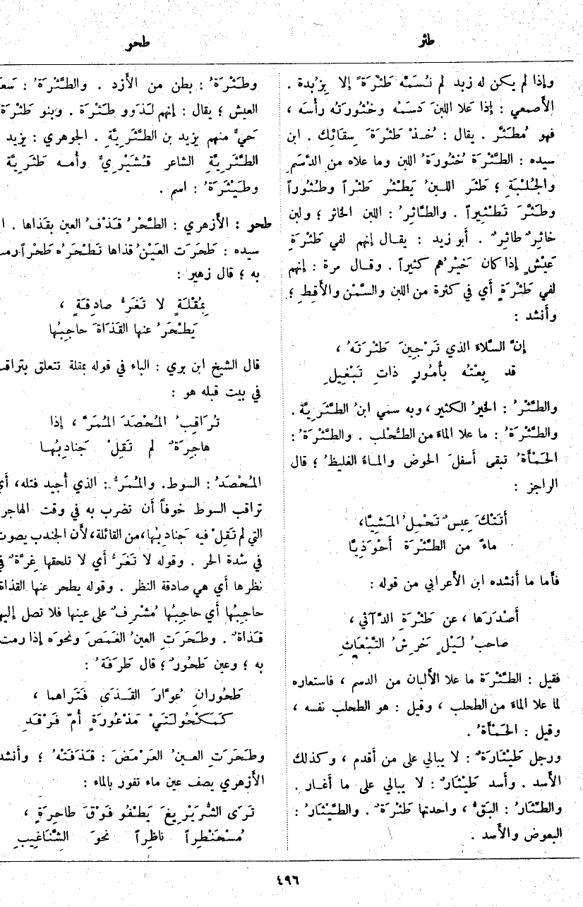 طحر: الأَزهري: الطَّحْرُ قَذْفُ الْعَيْنِ بقَذاها. ابْنُ سِيدَهْ: طَحَرَت العَيْنُ قَذَاهَا تَطْحَرُه طَحْراً رَمَتْ بِهِ؛ قَالَ زُهَيْرٌ: