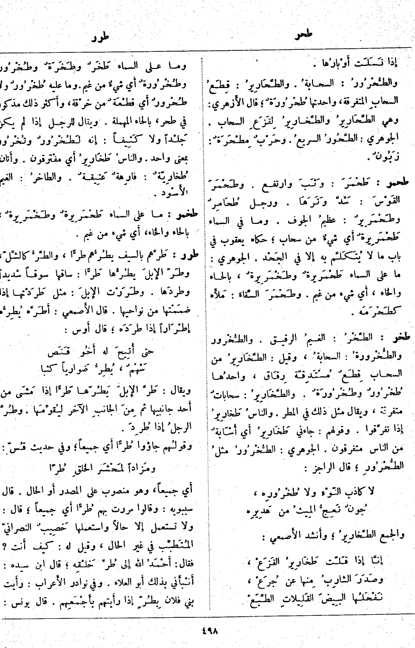 طخر: الطَّخْرُ: الغيمُ الرَّقِيقُ. والطُّخْرور والطُّخْرورةُ: السحابةُ، وَقِيلَ: الطَّخَارِيرُ مِنَ السَّحَابِ قِطَعٌ مُسْتَدِقّة رِقَاق، واحدُها طُخْرُورٌ وطُخْرُورَةٌ. والطَّخَارِيرُ: سحاباتٌ مُتَفَرِّقَةٌ، وَيُقَالُ مِثْلُ ذَلِكَ فِي الْمَطَرِ. والناسُ طَخارِيرُ إِذا تفرَّقوا. وَقَوْلُهُمْ: جَاءَنِي طَخَارِيرُ أَي أُشَابَةٌ مِنَ النَّاسِ مُتَفَرِّقُونَ. الْجَوْهَرِيُّ: الطُّخْرُورُ مثلُ الطُّحْرُورِ؛ قَالَ الرَّاجِزُ: