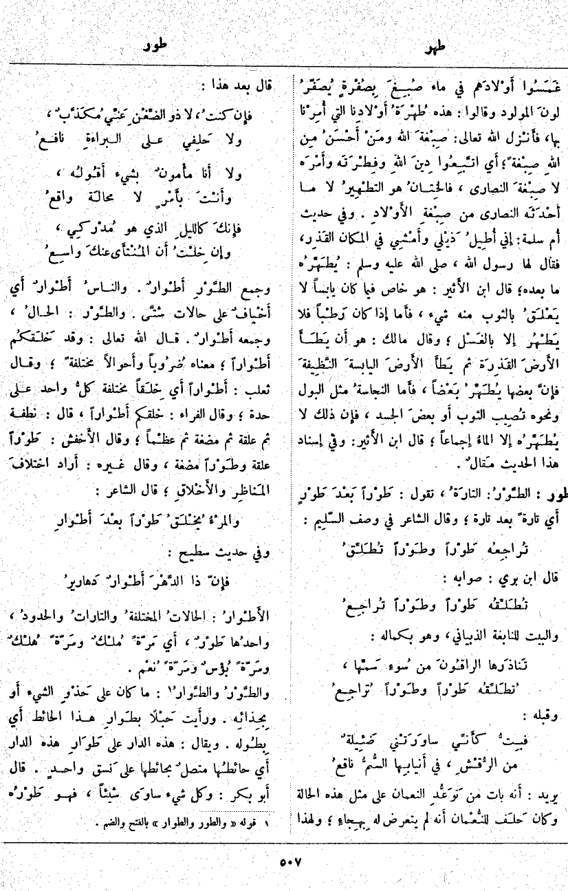 الأَطْوارُ: الحالاتُ المختلفةُ والتاراتُ والحدودُ، واحدُها طَوْرٌ، أَي مَرّةً مُلْكٌ ومَرَّةً هُلْكٌ ومَرّةً بُؤْسٌ ومَرّةً نُعْم. والطَّوْرُ والطَّوارُ «1»: مَا كَانَ عَلَى حَذْوِ الشَّيْءِ أَو بِحِذائِه. ورأَيت حَبْلًا بطَوارِ هَذَا الْحَائِطِ أَي بِطُوله. وَيُقَالُ: هَذِهِ الدَّارُ عَلَى طَوَارِ هَذِهِ الدَّارِ أَي حائطُها متصلٌ بحائطها عَلَى نَسق واحدٍ. قَالَ أَبو بَكْرٍ: وَكُلُّ شَيْءٍ ساوَى شَيْئًا، فَهُوَ طَوْرُه