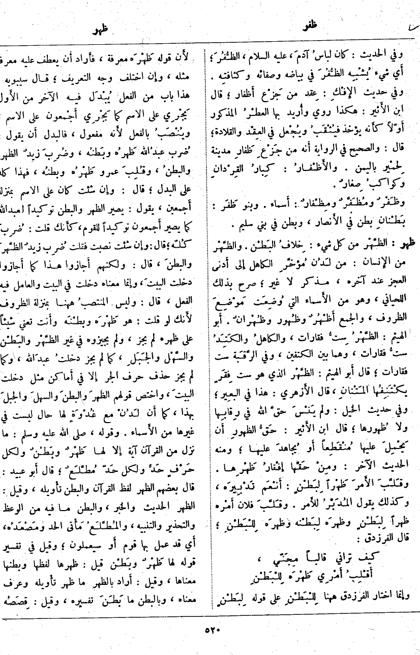 ظهر: الظَّهْر مِنْ كُلِّ شَيْءٍ: خِلافُ البَطْن. والظَّهْر مِنَ الإِنسان: مِنْ لَدُن مُؤخَّرِ الْكَاهِلِ إِلى أَدنى الْعَجُزِ عِنْدَ آخِرِهِ، مُذَكَّرٌ لَا غَيْرُ، صَرَّحَ بِذَلِكَ اللِّحْيَانِيُّ، وَهُوَ مِنَ الأَسماء الَّتِي وُضِعَت مَوْضِعَ الظُّرُوفِ، وَالْجَمْعُ أَظْهُرٌ وظُهور وظُهْرانٌ. أَبو الْهَيْثَمِ: الظَّهْرُ سِتُّ فقارات، والكاهلُ والكَتِدُ [الكَتَدُ] ستُّ فَقَارَاتٍ، وَهُمَا بَيْنَ الْكَتِفَيْنِ، وَفِي الرَّقبَة سِتُّ فقارات؛ قال أَبو الهيثم: الظَّهْر الَّذِي هُوَ سِتُّ فِقَرٍ يكْتَنِفُها المَتْنانِ، قَالَ الأَزهري: هَذَا فِي الْبَعِيرِ؛ وَفِي حَدِيثِ الْخَيْلِ: