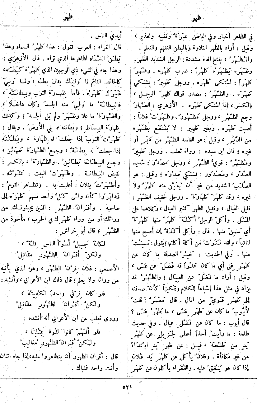 فِي الظَّاهِرِ أَخبار وَفِي الْبَاطِنِ عَبْرَةٌ وَتَنْبِيهٌ وَتَحْذِيرٌ، وَقِيلَ: أَراد بِالظَّهْرِ التِّلَاوَةَ وَبِالْبَطْنِ التَّفَهُّمَ وَالتَّعَلُّمَ. والمُظَهَّرُ، بِفَتْحِ الْهَاءِ مُشَدَّدَةً: الرَّجُلُ الشَّدِيدُ الظَّهْرِ. وظَهَره يَظْهَرُه ظَهْراً: ضَرَبَ ظَهْره. وظَهِرَ ظَهَراً: اشْتَكَى ظَهْره. وَرَجُلٌ ظَهِيرٌ: يَشْتَكِي ظَهْرَه. والظَّهَرُ: مَصْدَرُ قَوْلِكَ ظَهِرَ الرَّجُلُ، بِالْكَسْرِ، إِذا اشْتَكَى ظَهْره. الأَزهري: الظُّهارُ وَجَعُ الظَّهْرِ، وَرَجُلٌ مَظْهُورٌ. وظَهَرْتُ فُلَانًا: أَصبت ظَهْره. وَبَعِيرٌ ظَهِير: لَا يُنْتَفَع بظَهْره مِنَ الدَّبَرِ، وَقِيلَ: هُوَ الْفَاسِدُ الظَّهْر مِنْ دَبَرٍ أَو غيره؛ قال ابن سيده: رَوَاهُ ثَعْلَبٌ. وَرَجُلٌ ظَهيرٌ ومُظَهَّرٌ: قويُّ الظَّهْرِ وَرَجُلٌ مُصَدَّر: شَدِيدُ الصَّدْر، ومَصْدُور: يَشْتَكِي صَدْرَه؛ وَقِيلَ: هُوَ الصُّلْبُ الشَّدِيدُ مِنْ غَيْرِ أَن يُعَيَّن مِنْهُ ظَهْرٌ وَلَا غَيْرُهُ، وَقَدْ ظَهَرَ ظَهَارَةً. وَرَجُلٌ خَفِيفُ الظَّهْر: قَلِيلُ الْعِيَالِ، وَثَقِيلُ الظَّهْرِ كَثِيرُ الْعِيَالِ، وَكِلَاهُمَا عَلَى المَثَل. وأَكَل الرجُل أَكْلَةً ظَهَرَ مِنْهَا ظَهْرَةً أَي سَمِنَ مِنْهَا. قَالَ: وأَكل أَكْلَةً إِن أَصبح مِنْهَا لَنَاتِيًّا، وَلَقَدْ نَتَوْتُ مِنْ أَكلة أَكلتها؛ يَقُولُ: سَمِنْتُ مِنْهَا. وَفِي الْحَدِيثِ: