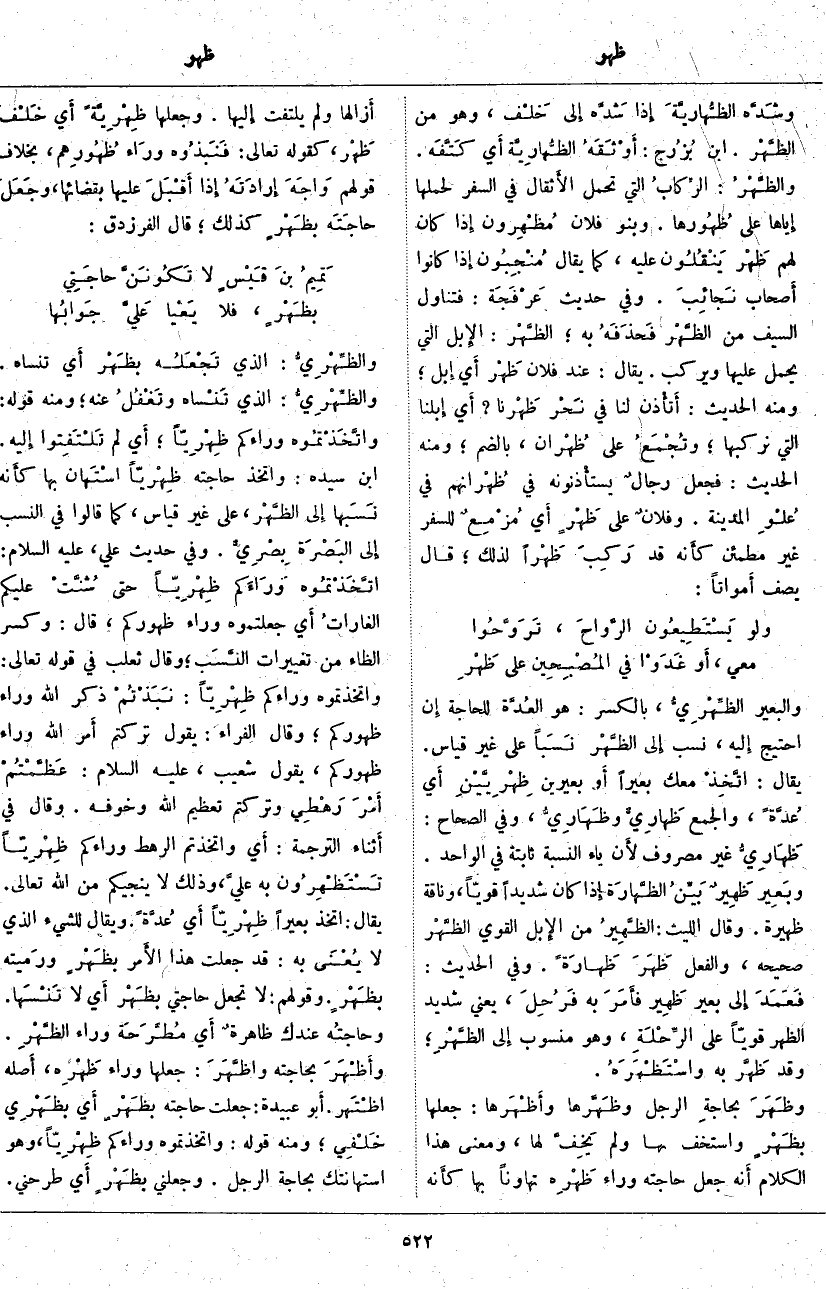 وَقَالَ فِي أَثناء التَّرْجَمَةِ: أَي وَاتَّخَذْتُمُ الرَّهْطَ وَرَاءَكُمْ ظِهْرِيّاً تَسْتَظْهِرُون بِهِ عليَّ، وَذَلِكَ لَا يُنْجِيكُمْ مِنَ اللَّهِ تَعَالَى. يُقَالُ: اتَّخَذَ بَعِيرًا ظِهْرِيّاً أَي عُدَّةً. وَيُقَالُ لِلشَّيْءِ الَّذِي لَا يُعْنَى بِهِ: قَدْ جَعَلْتُ هَذَا الأَمر بظَهْرٍ ورَميته بظَهْرٍ. وقولهم. ولا تَجْعَلْ حَاجَتِي بظَهْر أَي لَا تَنْسَها. وحاجتُه عِنْدَكَ ظاهرةٌ أَي مُطَّرَحَة وَرَاءَ الظَّهْرِ. وأَظْهَرَ بِحَاجَتِهِ واظَّهَرَ: جَعَلَهَا وَرَاءَ ظَهْرِه، أَصله اظْتَهر. أَبو عُبَيْدَةَ: جَعَلْتُ حاجته بظَهْرٍ أَي بظَهْرِي خَلْفِي؛ وَمِنْهُ قَوْلُهُ: وَاتَّخَذْتُمُوهُ وَراءَكُمْ ظِهْرِيًّا