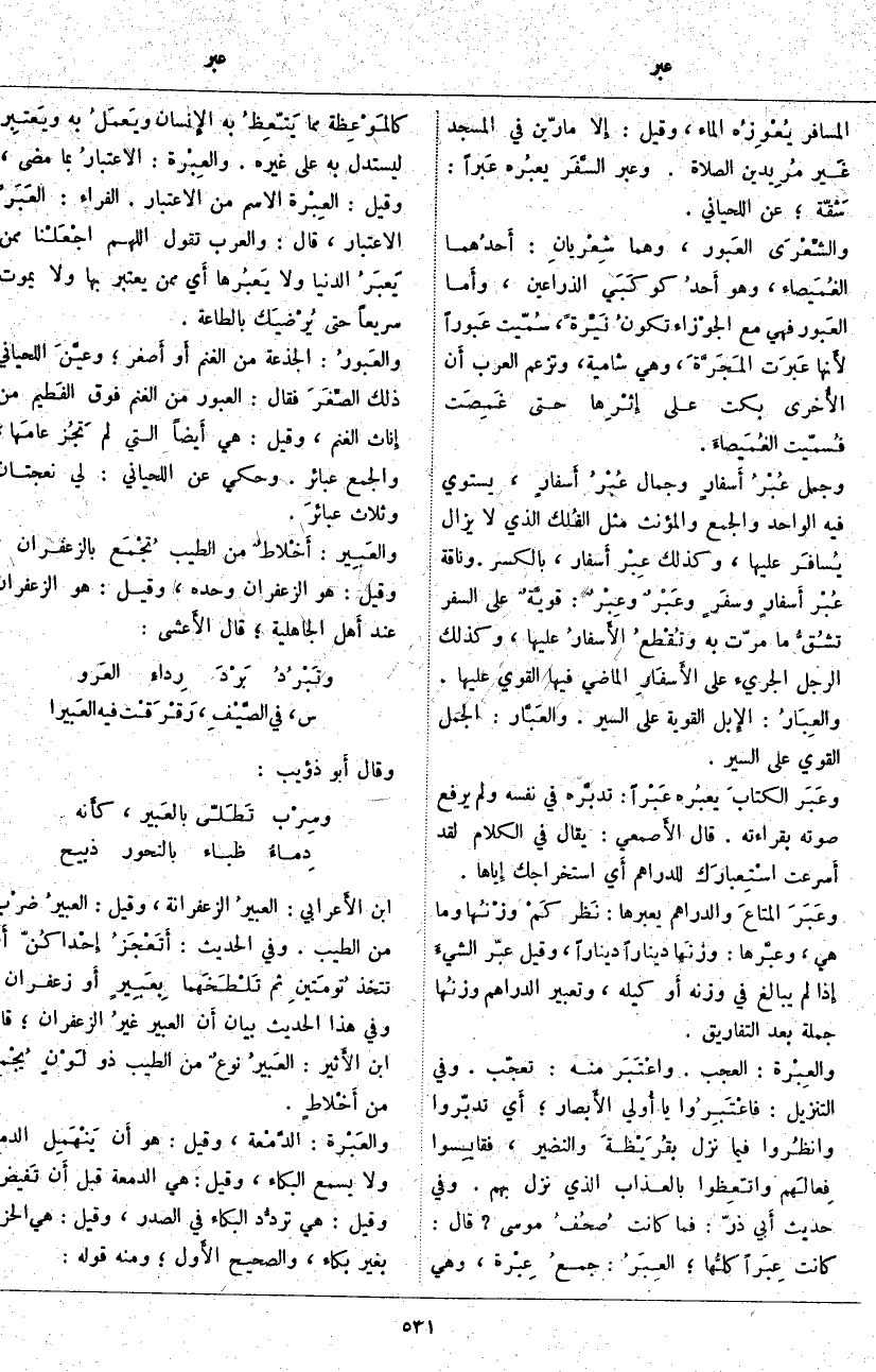 الْمُسَافِرَ يُعْوِزُه الْمَاءُ، وَقِيلَ: إِلا مَارِّينَ فِي الْمَسْجِدِ غَير مُرِيدين الصَّلَاةَ. وَعَبَرَ السَّفَر يعبُره عَبراً: شَقّة؛ عَنِ اللِّحْيَانِيِّ. والشِّعْرَى العَبور، وَهُمَا شِعْريانِ: أَحدُهما الغُمَيصاء، وَهُوَ أَحدُ كوكَبَي الذِّرَاعَيْنِ، وأَما العَبور فَهِيَ مَعَ الجوْزاء تكونُ نيِّرةً، سُمّيت عَبوراً لأَنها عَبَرت المَجَرَّةَ، وَهِيَ شَامِيَّةٌ، وَتَزْعُمُ الْعَرَبُ أَن الأُخرى بَكَتْ عَلَى إِثْرِها حَتَّى غَمِصَت فسُمّيت الغُمَيْصاءَ. وَجَمَلٌ عُبْرُ أَسفارٍ وَجِمَالٌ عُبْرُ أَسفارٍ، يَسْتَوِي فِيهِ الْوَاحِدُ وَالْجَمْعُ وَالْمُؤَنَّثُ مِثْلُ الفُلك الَّذِي لَا يَزَالُ يُسافَر عَلَيْهَا، وَكَذَلِكَ عِبْر أَسفار، بِالْكَسْرِ. وَنَاقَةٌ عُبْر أَسْفارٍ وسفَرٍ وعَبْرٌ وعِبْرٌ: قويَّةٌ عَلَى السَّفَرِ تشُقُّ مَا مَرَّتْ بِهِ وتُقْطعُ الأَسفارُ عَلَيْهَا، وَكَذَلِكَ الرَّجُلُ الْجَرِيءُ عَلَى الأَسفَارِ الْمَاضِي فِيهَا الْقَوِيُّ عَلَيْهَا. والعِبَارُ: الإِبل الْقَوِيَّةُ عَلَى السَّيْرِ. والعَبَّار: الْجَمَلُ الْقَوِيُّ عَلَى السَّيْرِ. وعَبَر الكتابَ يعبُره عَبْراً: تدبَّره فِي نَفْسِهِ وَلَمْ يَرْفَعْ صَوْتَهُ بِقِرَاءَتِهِ. قَالَ الأَصمعي: يُقَالُ فِي الْكَلَامِ لَقَدْ أَسرعت اسْتِعبارَك لِلدَّرَاهِمِ أَي اسْتِخْرَاجَكَ إِياها. وعَبَرَ المتاعَ وَالدَّرَاهِمَ يَعْبُرُهَا: نَظر كَمْ وزْنُها وَمَا هِيَ، وعبَّرها: وزنَها دِينَارًا دِينَارًا، وَقِيلَ عَبَّرَ الشيءَ إِذا لَمْ يُبَالِغْ فِي وَزْنِهِ أَو كَيْلِهِ، وَتَعْبِيرُ الدَّرَاهِمِ وزنُها جُمْلَةً بَعْدَ التَّفَارِيقِ. والعِبْرة: الْعَجَبُ. واعْتَبَر مِنْهُ: تَعَجَّبَ. وَفِي التَّنْزِيلِ: فَاعْتَبِرُوا يَا أُولِي الْأَبْصارِ