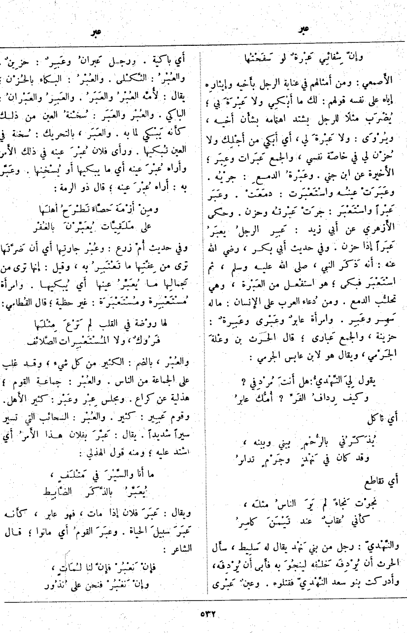 الأَصمعي: وَمِنْ أَمثالهم فِي عِنَايَةِ الرَّجُلِ بأَخيه وإِيثارِه إِياه عَلَى نَفْسِهِ قَوْلُهُمْ: لَكَ مَا أَبْكِي وَلَا عَبْرَةَ بِي؛ يُضْرَب مَثَلًا لِلرَّجُلِ يَشْتَدُّ اهْتِمَامُهُ بشأْن أَخيه، ويُرْوَى: وَلَا عَبْرَة لِي، أَي أَبكي مِنْ أَجْلِك وَلَا حُزْن لِي فِي خَاصَّةِ نَفْسِي، وَالْجَمْعُ عَبَرات وعِبَر؛ الأَخيرة عَنِ ابْنِ جِنِّي. وعَبْرةُ الدمعِ: جرْيُه. وعَبَرَتْ عينُه واسْتَعْبَرت: دمَعَتْ. وعَبَر عَبْراً واسْتَعْبَر: جرَتْ عَبْرتُه وَحَزِنَ. وَحَكَى الأَزهري عَنْ أَبي زَيْدٍ: عَبِر الرجلُ يعبَرُ عَبَراً إِذا حَزِنَ. وَفِي حَدِيثِ
