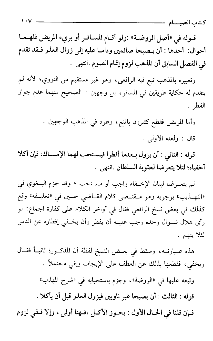 قوله في "أصل الروضة": ولو أقام المسافر أو بريء المريض فلهما أحوال: أحدها: أن يصبحا صائمين وداما عليه إلى زوال العذر فقد تقدم في الفصل السابق أن المذهب لزوم إتمام الصوم. انتهى.