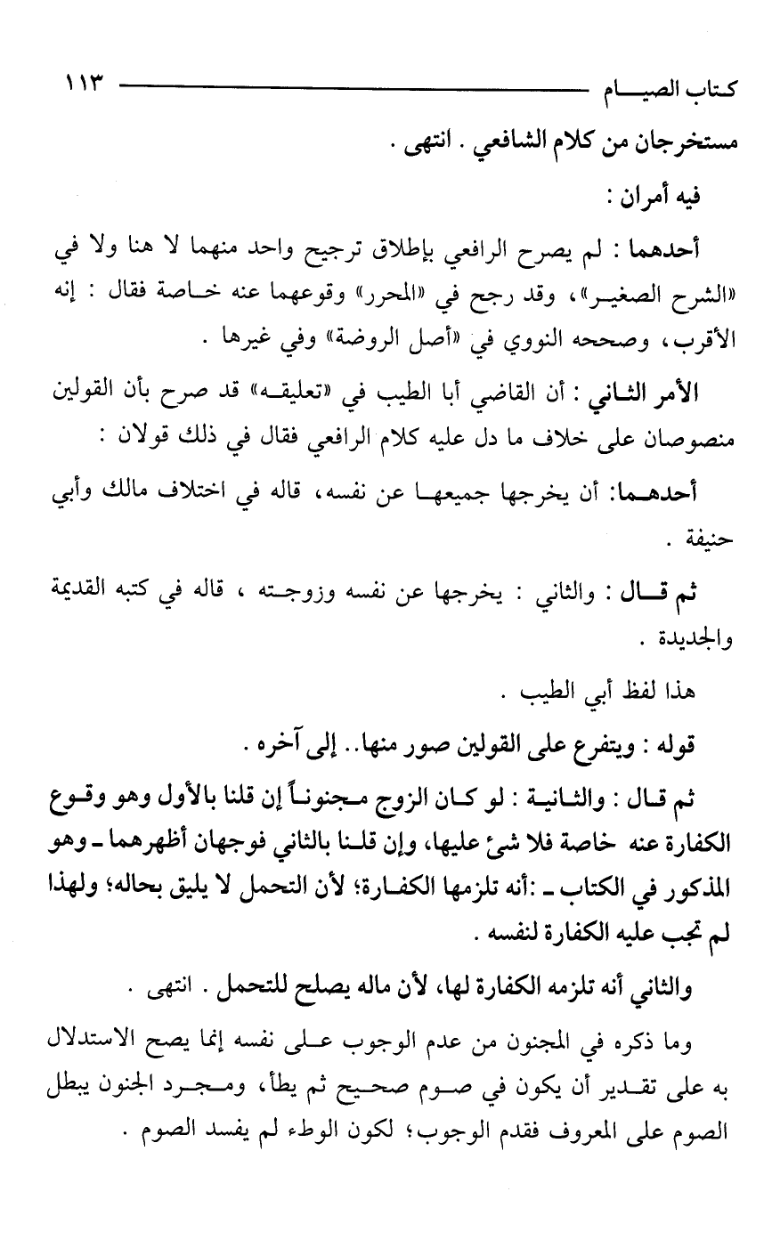 ثم قال: والثانية: لو كان الزوج مجنونًا إن قلنا بالأول وهو وقوع الكفارة عنه خاصة فلا شئ عليها، وإن قلنا بالثاني فوجهان أظهرهما -وهو المذكور في الكتاب-: أنه تلزمها الكفارة؛ لأن التحمل لا يليق بحاله؛ ولهذا لم تجب عليه الكفارة لنفسه.