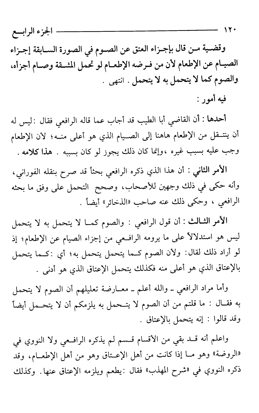 الأمر الثالث: أن قول الرافعي: والصوم كما لا يتحمل به لا يتحمل ليس هو استدلالًا على ما يرومه الرافعي من إجزاء الصيام عن الإطعام؛ إذ لو أراد ذلك لقال: ولأن الصوم كما يتحمل يتحمل به؛ أي: كما يتحمل بالإعتاق الذي هو أعلى منه فكذلك يتحمل الإعتاق الذي هو أدنى.