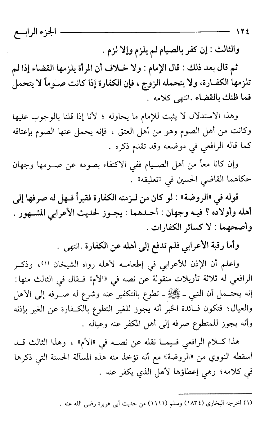 هذا كلام الرافعي فيما نقله عن نصه في "الأم"، وهذا الثالث قد أسقطه النووي من "الروضة" مع أنه تؤخذ منه هذه المسألة الحسنة التي ذكرها في كلامه؛ وهي إعطاؤها لأهل الذي يكفر عنه.