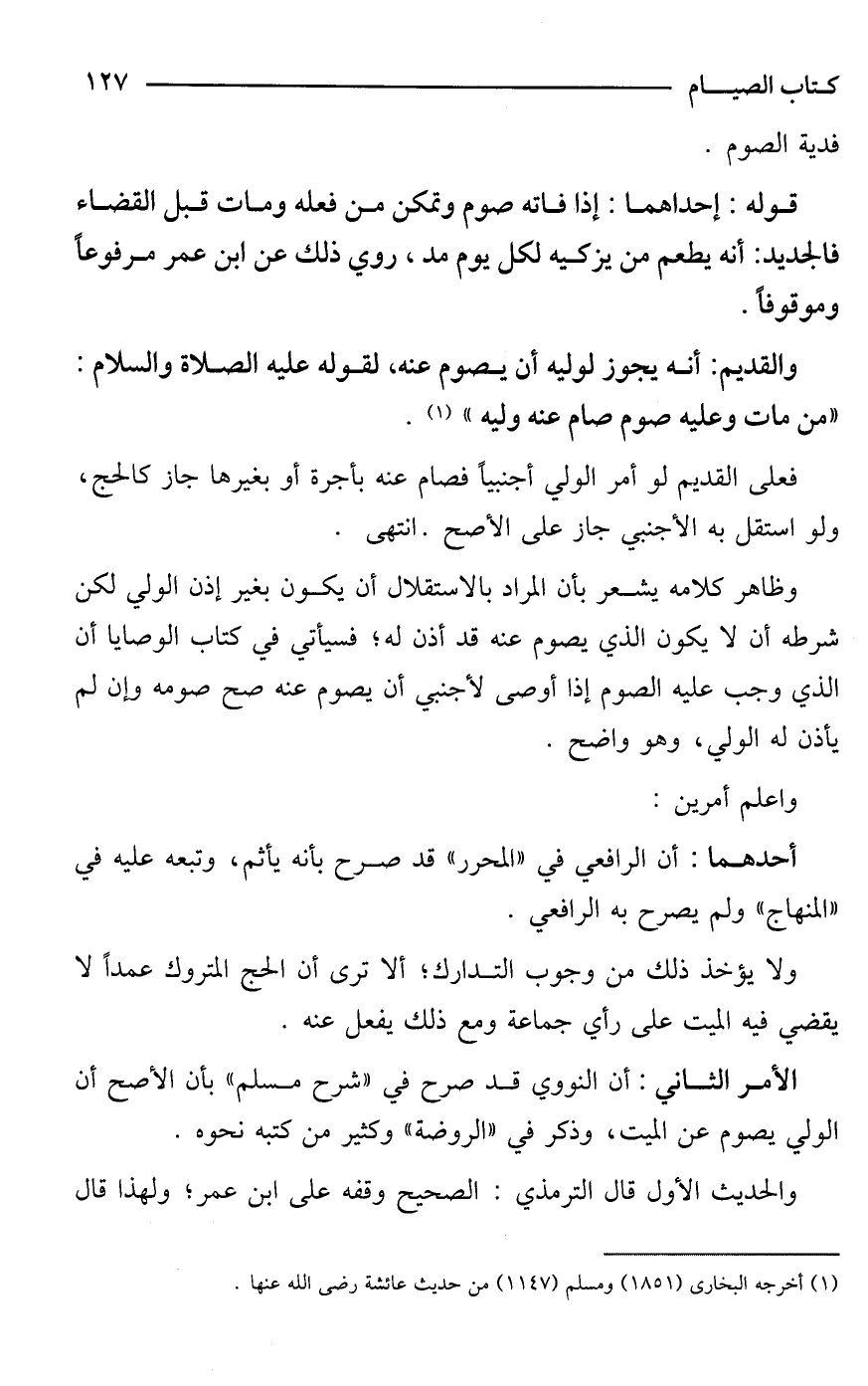 الأمر الثاني: أن النووي قد صرح في "شرح مسلم" بأن الأصح أن الولي يصوم عن الميت، وذكر في "الروضة" وكثير من كتبه نحوه.
