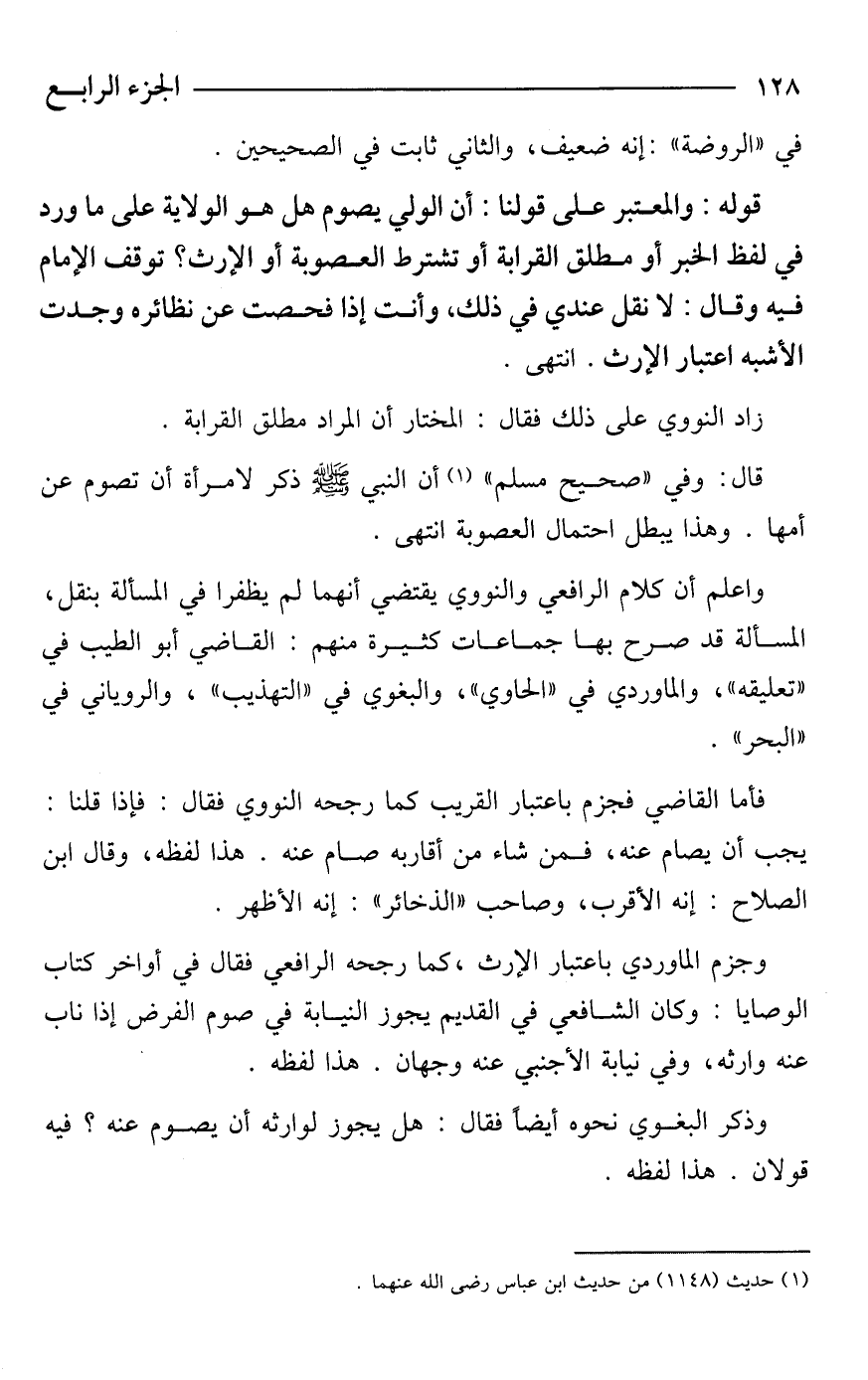 قوله: والمعتبر على قولنا: أن الولي يصوم هل هو الولاية على ما ورد في لفظ الخبر أو مطلق القرابة أو تشترط العصوبة أو الإرث؟ توقف الإمام فيه وقال: لا نقل عندي في ذلك، وأنت إذا فحصت عن نظائره وجدت الأشبه اعتبار الإرث. انتهى.