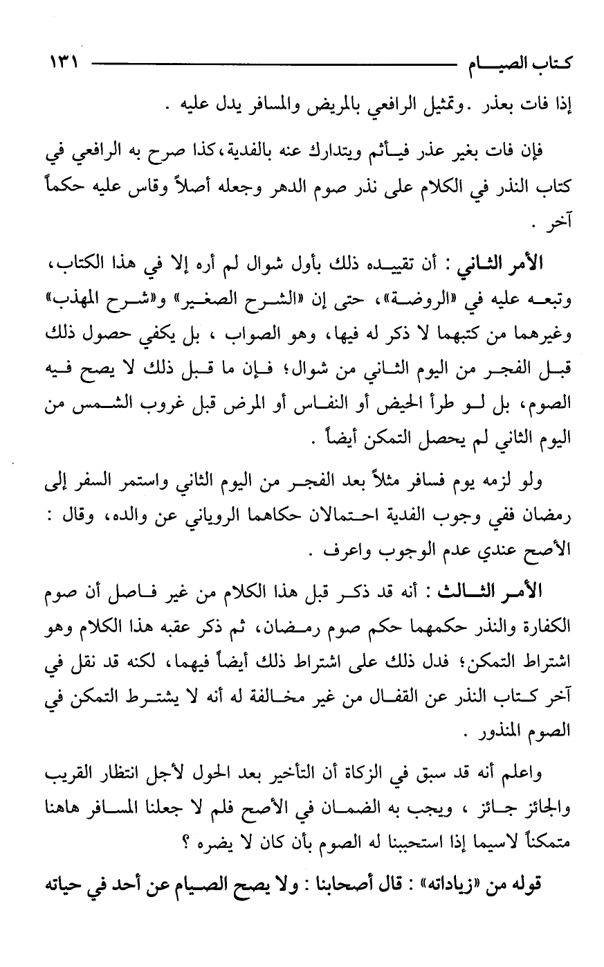 الأمر الثالث: أنه قد ذكر قبل هذا الكلام من غير فاصل أن صوم الكفارة والنذر حكمهما حكم صوم رمضان، ثم ذكر عقبه هذا الكلام وهو اشتراط التمكن؛ فدل ذلك على اشتراط ذلك أيضًا فيهما، لكنه قد نقل في آخر كتاب النذر عن القفال من غير مخالفة له أنه لا يشترط التمكن في الصوم المنذور.