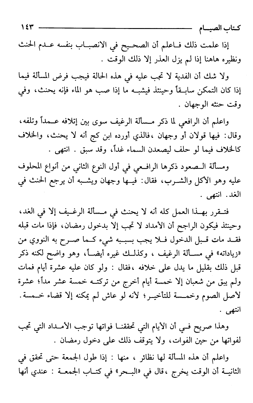 فتقرر بهذا العمل كله أنه لا يحنث في مسألة الرغيف إلا في الغد، وحينئذ فيكون الراجح أن الأمداد لا تجب إلا بدخول رمضان، فإذا مات قبله فقد مات قبل الدخول فلا يجب بسببه شيء كما صرح به النووي من "زياداته" في مسألة الرغيف، وكذلك غيره أيضًا، وهو واضح لكنه ذكر قبل ذلك بقليل ما يدل على خلافه، فقال: ولو كان عليه عشرة أيام فمات ولم يبق من شعبان إلا خمسة أيام أخرج من تركته خمسة عشر مدًا؛ عشرة لأصل الصوم وخمسة للتأخير؛ لأنه لو عاش لم يمكنه إلا قضاء خمسة. انتهى.