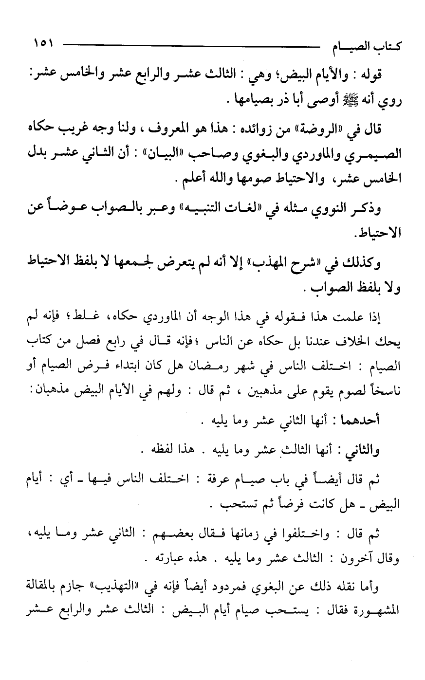 وأما نقله ذلك عن البغوي فمردود أيضًا فإنه في "التهذيب" جازم بالمقالة المشهورة فقال: يستحب صيام أيام البيض: الثالث عشر والرابع عشر