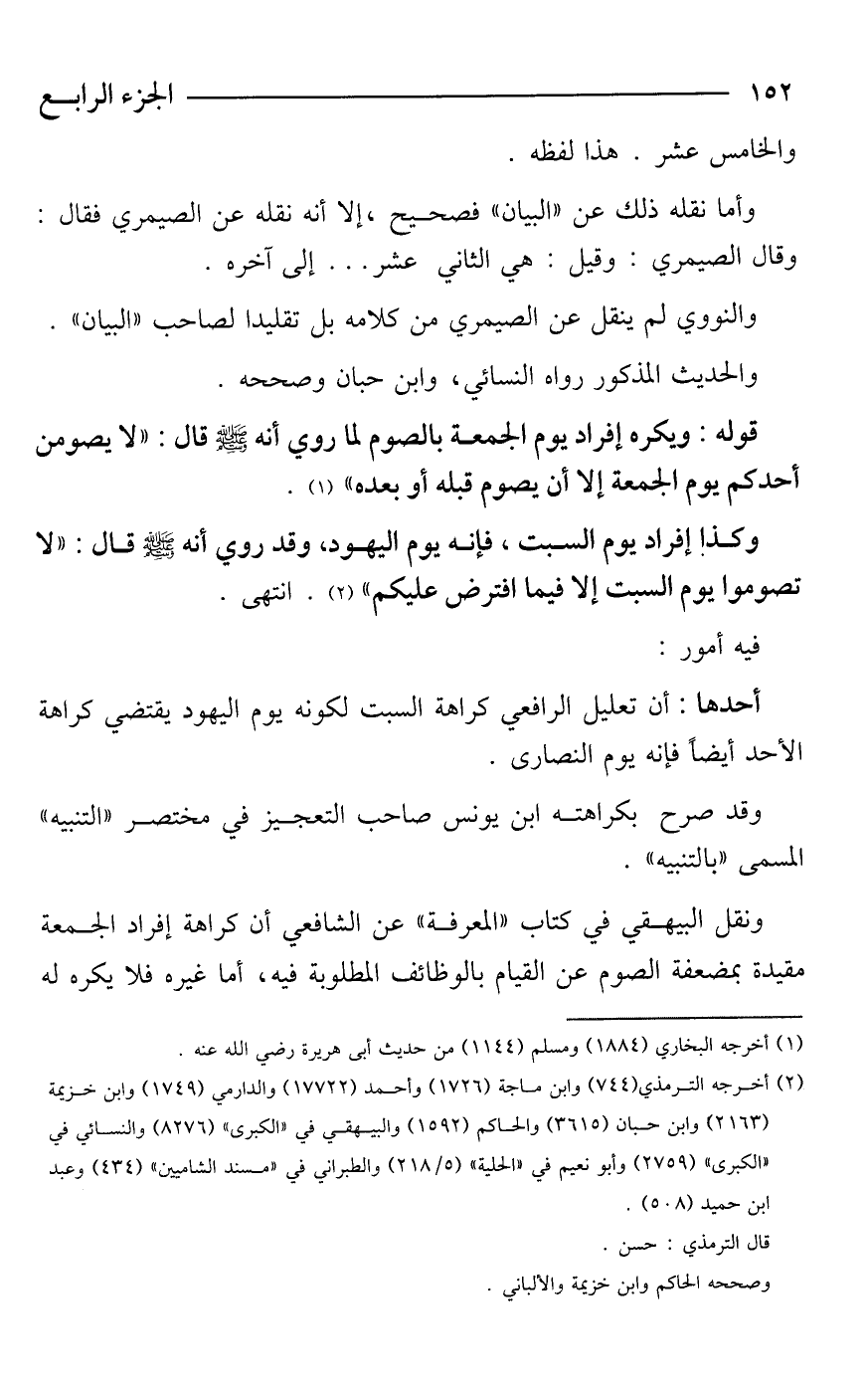 قوله: ويكره إفراد يوم الجمعة بالصوم لما روي أنه - صَلَّى اللَّهُ عَلَيْهِ وَسَلَّمَ - قال: "لا يصومن أحدكم يوم الجمعة إلا أن يصوم قبله أو بعده" (¬1).