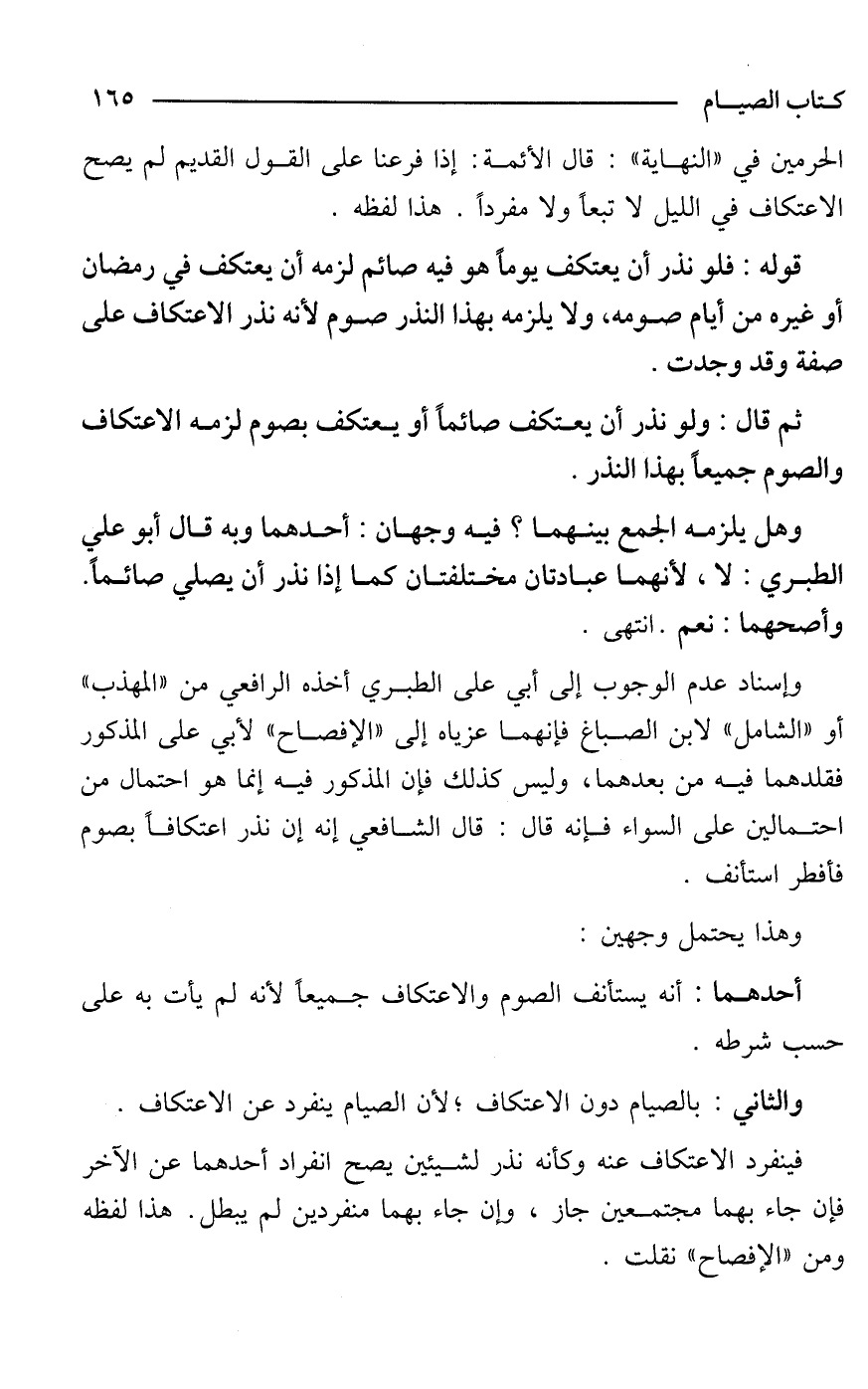 وإسناد عدم الوجوب إلى أبي على الطبري أخذه الرافعي من "المهذب" أو "الشامل" لابن الصباغ فإنهما عزياه إلى "الإفصاح" لأبي على المذكور فقلدهما فيه من بعدهما، وليس كذلك فإن المذكور فيه إنما هو احتمال من احتمالين على السواء فإنه قال: قال الشافعي إنه إن نذر اعتكافًا بصوم فأفطر استأنف.