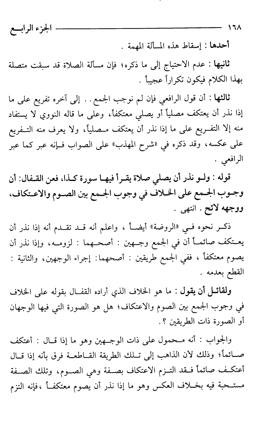 ثالثها: أن قول الرافعي فإن لم نوجب الجمع .. إلى آخره تفريع على ما إذا نذر أن يعتكف مصليًا أو يصلي معتكفًا، وعلى ما قاله النووي لا يستفاد منه إلا التفريع على ما إذا نذر أن يعتكف مصليًا، ولا يعرف منه التفريع على عكسه، وقد ذكره في "شرح المهذب" على الصواب فإنه عبر كما عبر الرافعي.
