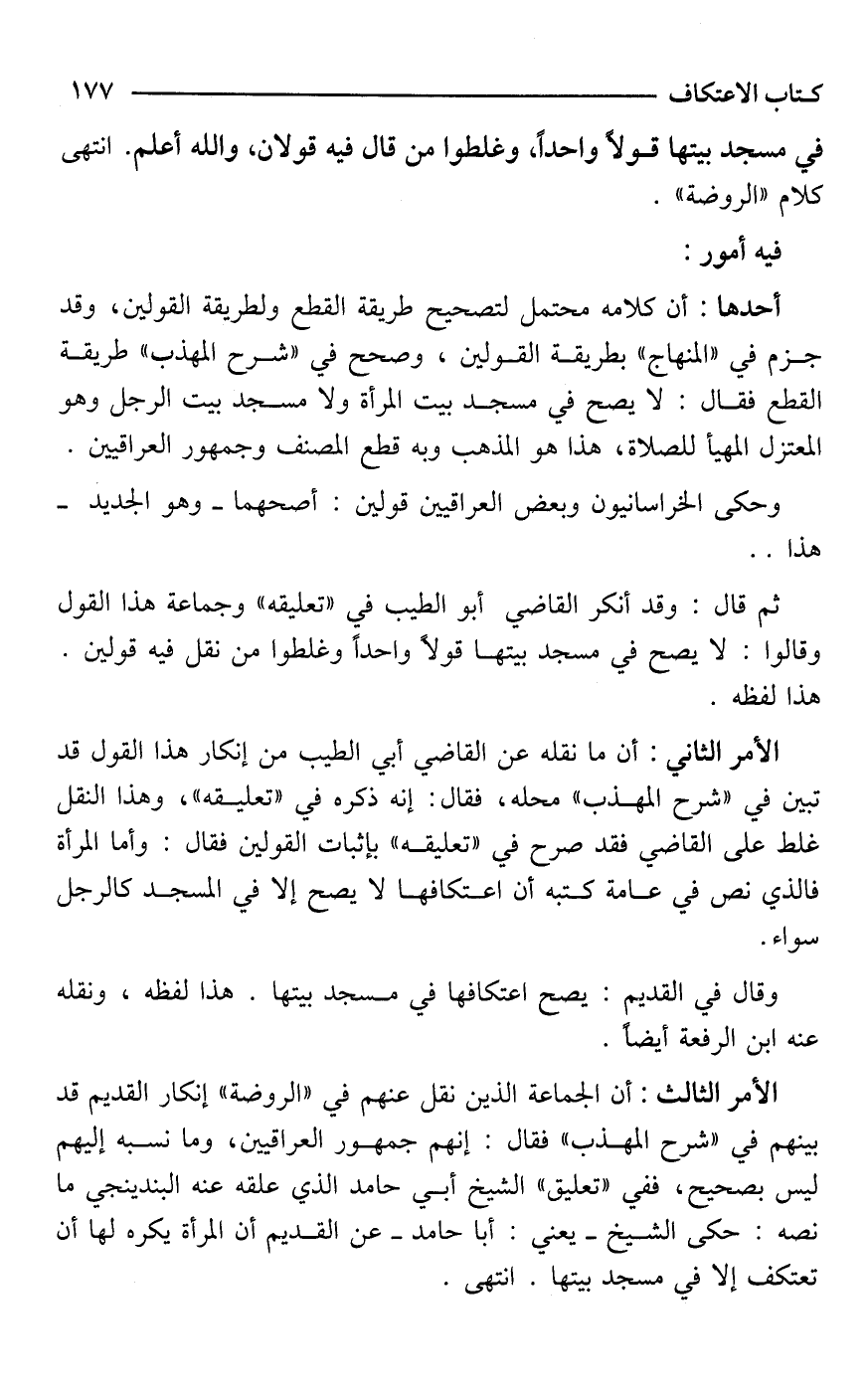 الأمر الثالث: أن الجماعة الذين نقل عنهم في "الروضة" إنكار القديم قد بينهم في "شرح المهذب" فقال: إنهم جمهور العراقيين، وما نسبه إليهم ليس بصحيح، ففي "تعليق" الشيخ أبي حامد الذي علقه عنه البندنيجي ما نصه: حكى الشيخ -يعني: أبا حامد- عن القديم أن المرأة يكره لها أن تعتكف إلا في مسجد بيتها. انتهى.