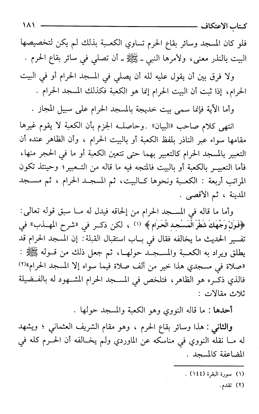 انتهى كلام صاحب "البيان". وحاصله الجزم بأن الكعبة لا يقوم غيرها مقامها سواء عبر الناذر بلفظ الكعبة أو بالبيت الحرام، وأن الظاهر عنده أن التعبير بالمسجد الحرام كالتعبير بهما حتى تتعين الكعبة أو ما في الحجر منها، فأما التعبير بالكعبة أو بالبيت فالمتجه فيه ما قاله من التعبير؛ وحينئذ تكون المراتب أربعة: الكعبة ونحوها كالبيت، ثم المسجد الحرام، ثم مسجد المدينة، ثم الأقصى.