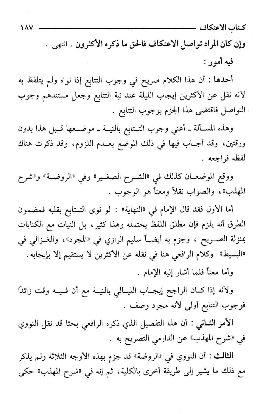أحدها: أن هذا الكلام صريح في وجوب التتابع إذا نواه ولم يتلفظ به لأنه نقل عن الأكثرين إيجاب الليلة عند نية التتابع وجعل مستندهم وجوب التواصل فاقتضى هذا الجزم بوجوب التتابع.