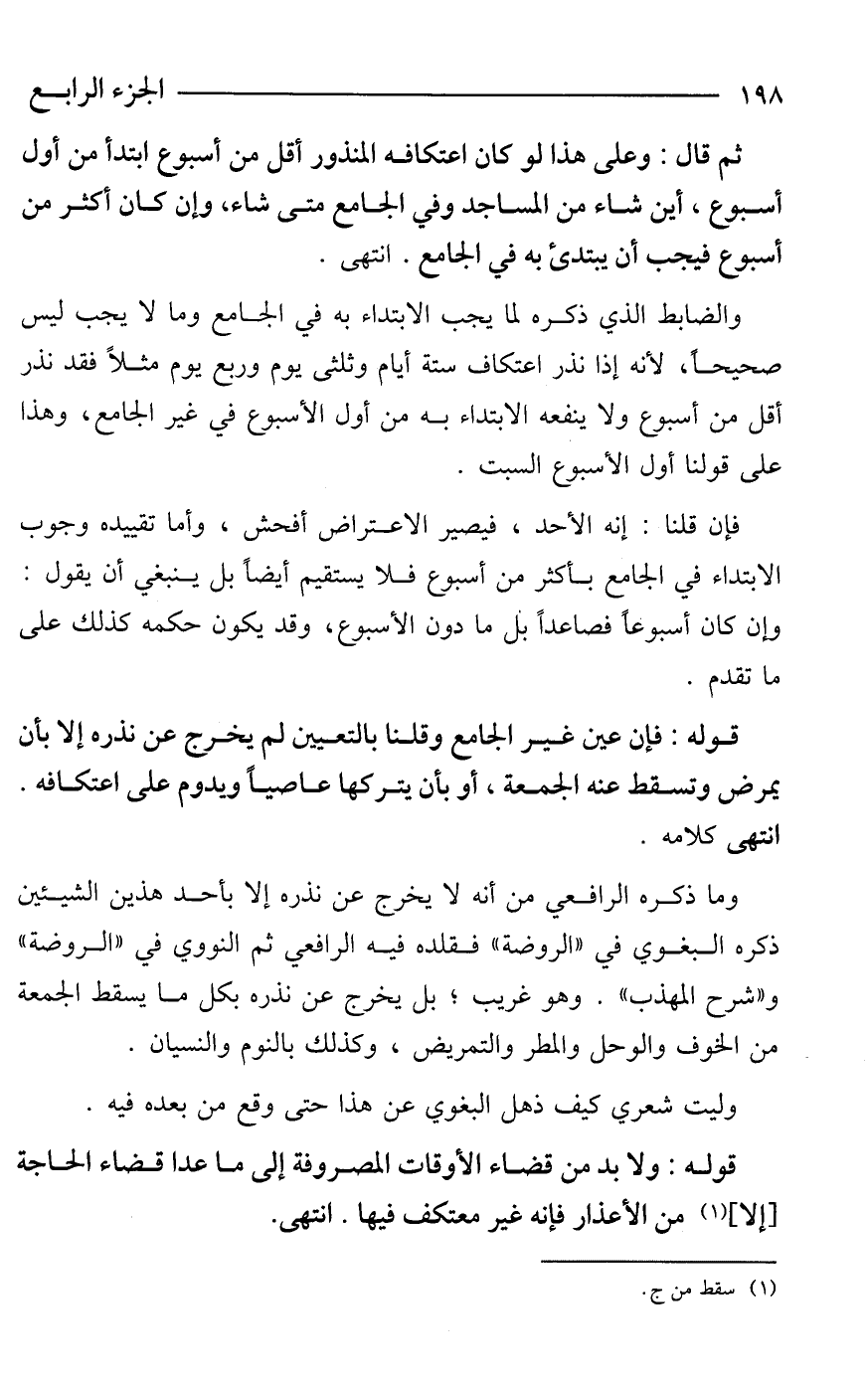 والضابط الذي ذكره لما يجب الابتداء به في الجامع وما لا يجب ليس صحيحًا، لأنه إذا نذر اعتكاف ستة أيام وثلثى يوم وربع يوم مثلًا فقد نذر أقل من أسبوع ولا ينفعه الابتداء به من أول الأسبوع في غير الجامع، وهذا على قولنا أول الأسبوع السبت.