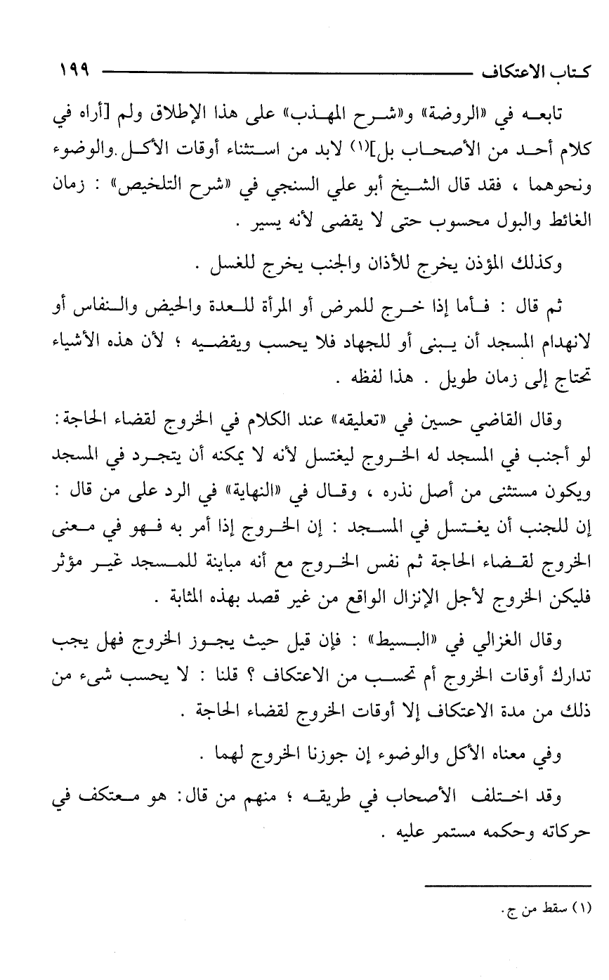 وقال القاضي حسين في "تعليقه" عند الكلام في الخروج لقضاء الحاجة: لو أجنب في المسجد له الخروج ليغتسل لأنه لا يمكنه أن يتجرد في المسجد ويكون مستثنى من أصل نذره، وقال في "النهاية" في الرد على من قال: إن للجنب أن يغتسل في المسجد: إن الخروج إذا أمر به فهو في معنى الخروج لقضاء الحاجة ثم نفس الخروج مع أنه مباينة للمسجد غير مؤثر فليكن الخروج لأجل الإنزال الواقع من غير قصد بهذه المثابة.