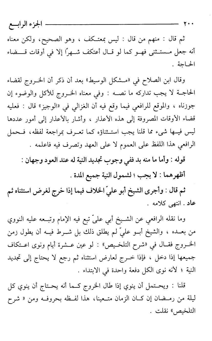 وما نقله الرافعي عن الشيخ أبي علىّ تبع فيه الإمام وتبعه عليه النووي من بعده، والشيخ أبو عليّ لم يطلق ذلك بل شرط فيه أن يطول زمن الخروج فقال في "شرح التلخيص": لو عين عشرة أيام ونوى اعتكاف جميعها إذا دخل، فإذا خرج لعارض استثناه ثم رجع لا يحتاج إلى تجديد النية؛ لأنه نوى الكل دفعة واحدة في الابتداء.