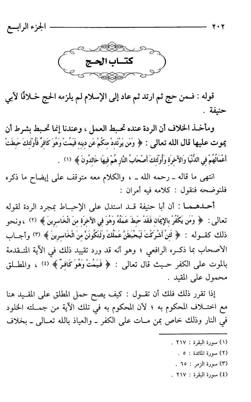 أحدهما: أن أبا حنيفة قد استدل على الإحباط بمجرد الردة لقوله تعالى: {وَمَنْ يَكْفُرْ بِالْإِيمَانِ فَقَدْ حَبِطَ عَمَلُهُ وَهُوَ فِي الْآخِرَةِ مِنَ الْخَاسِرِينَ} (¬2)، ونحو ذلك كقوله: {لَئِنْ أَشْرَكْتَ لَيَحْبَطَنَّ عَمَلُكَ وَلَتَكُونَنَّ مِنَ الْخَاسِرِينَ} (¬3) وأجاب الأصحاب بما ذكره الرافعي؛ وهو أنه قد ورد تقييد ذلك في الآية المتقدمة بالموت على الكفر حيث قال تعالى: {فَيَمُتْ وَهُوَ كَافِرٌ} (¬4)، والمطلق محمول على المقيد.