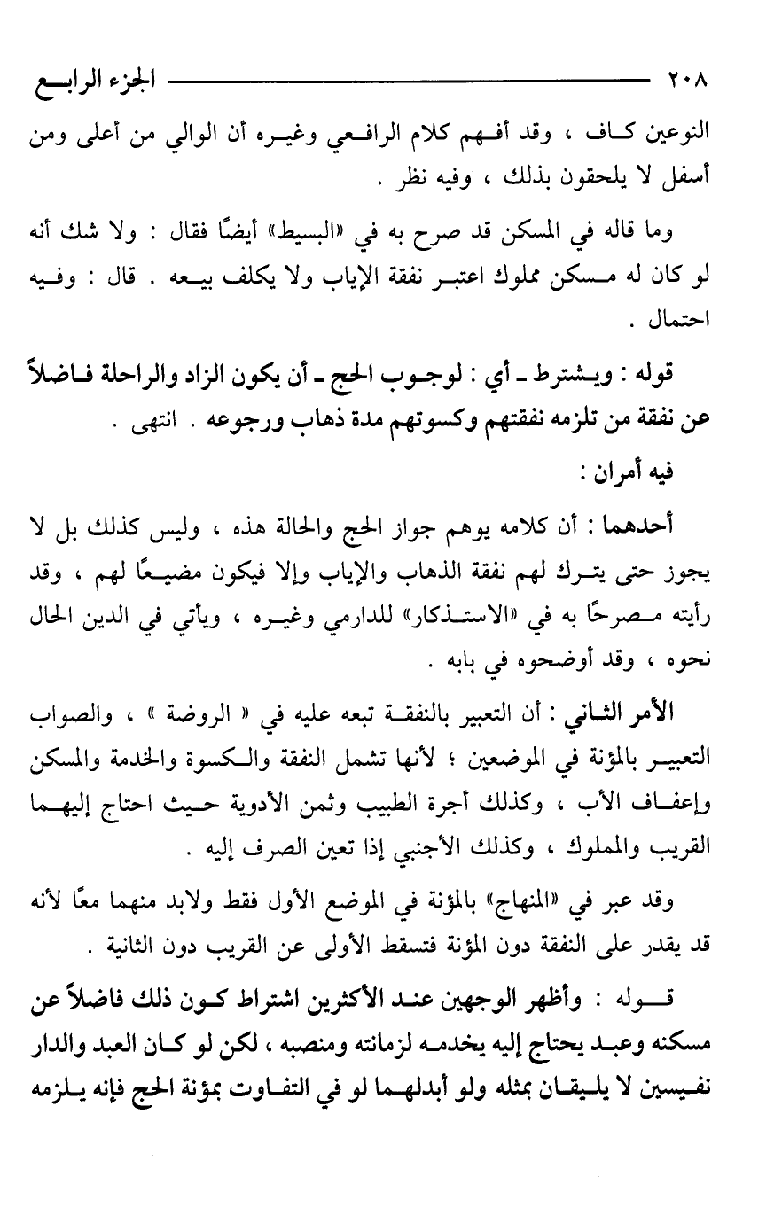 قوله: ويشترط -أي: لوجوب الحج- أن يكون الزاد والراحلة فاضلًا عن نفقة من تلزمه نفقتهم وكسوتهم مدة ذهاب ورجوعه. انتهى.