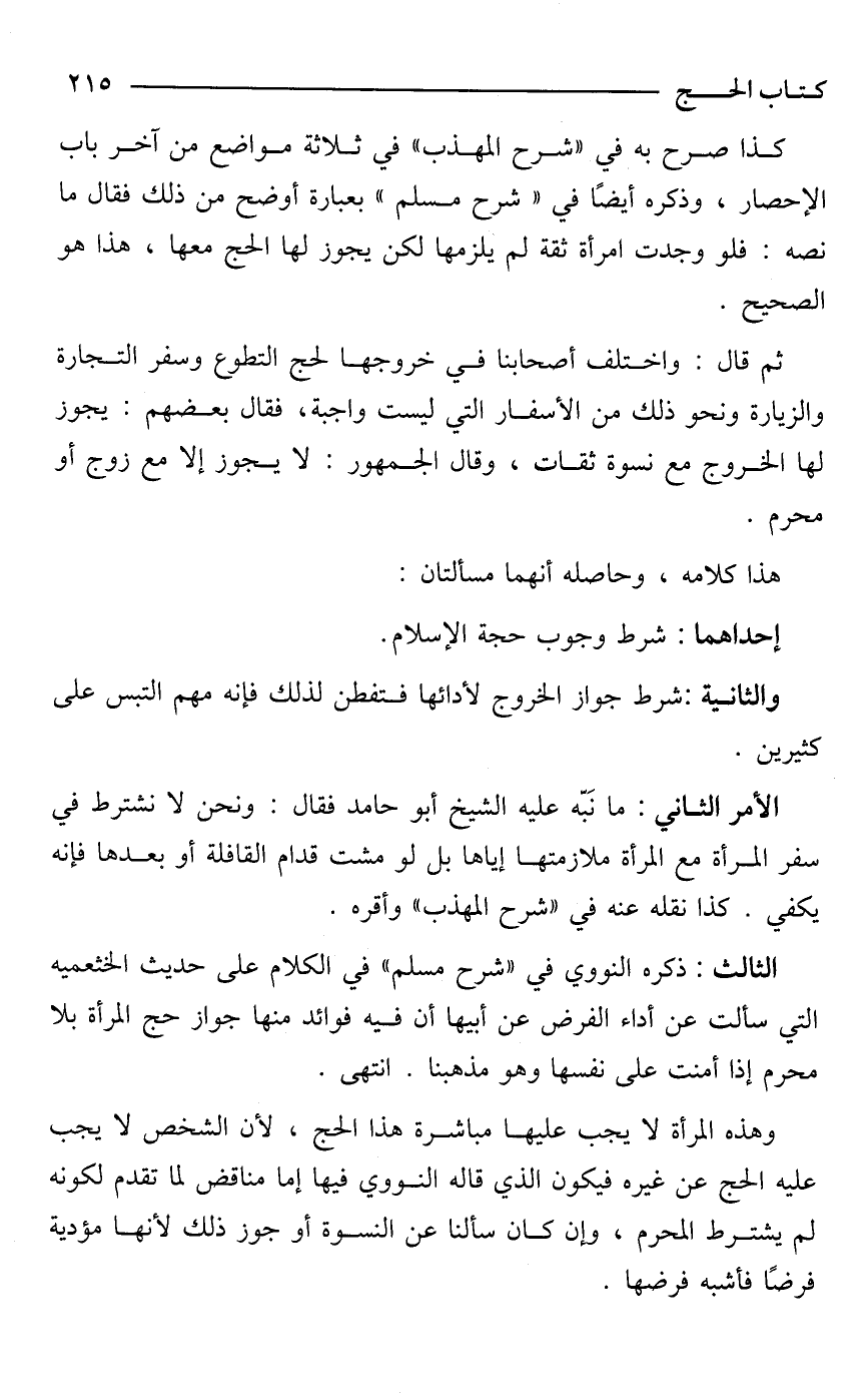 وهذه المرأة لا يجب عليها مباشرة هذا الحج، لأن الشخص لا يجب عليه الحج عن غيره فيكون الذي قاله النووي فيها إما مناقض لما تقدم لكونه لم يشترط المحرم، وإن كان سألنا عن النسوة أو جوز ذلك لأنها مؤدية فرضًا فأشبه فرضها.