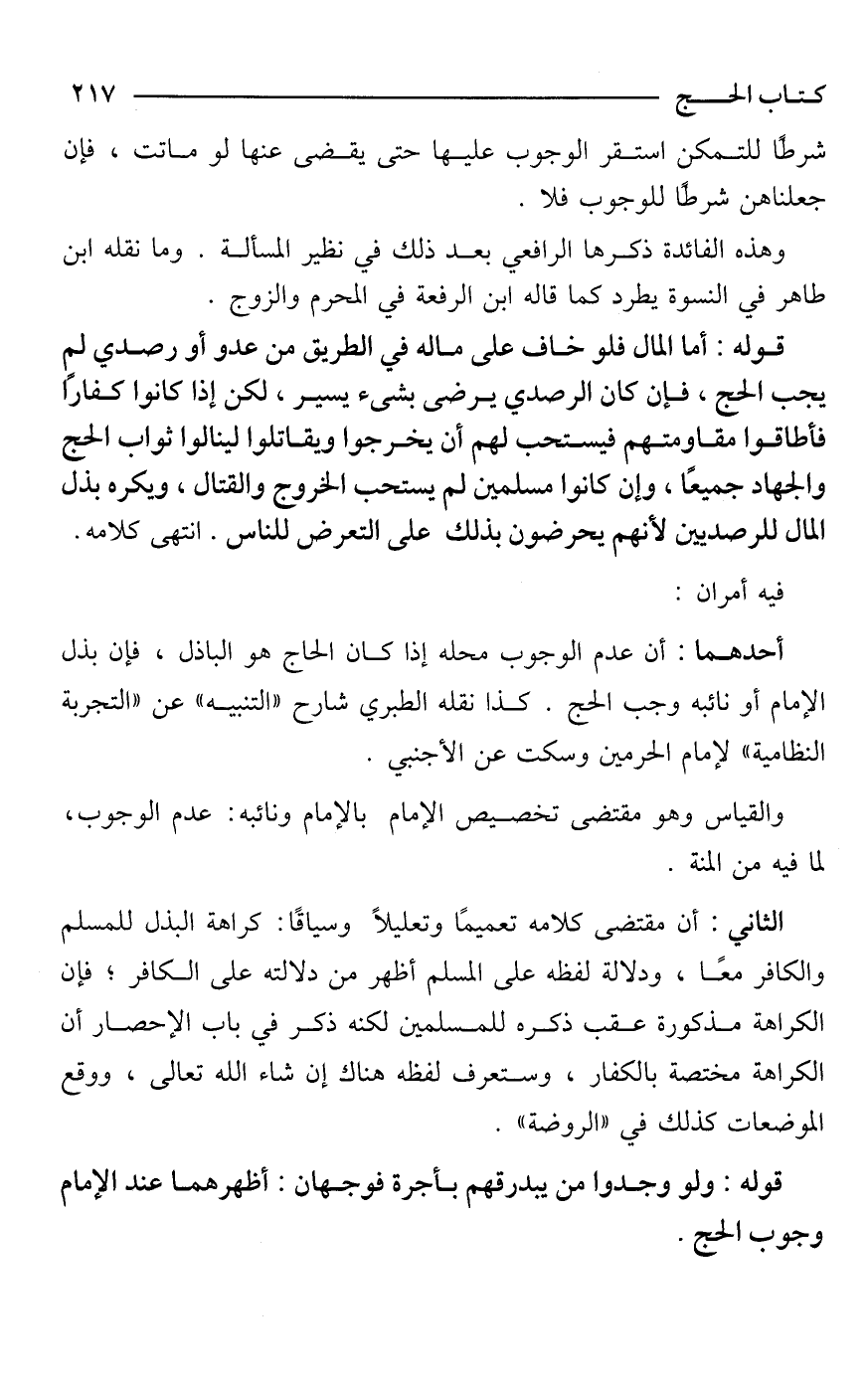 قوله: أما المال فلو خاف على ماله في الطريق من عدو أو رصدي لم يجب الحج، فإن كان الرصدي يرضى بشيء يسير، لكن إذا كانوا كفارًا فأطاقوا مقاومتهم فيستحب لهم أن يخرجوا ويقاتلوا لينالوا ثواب الحج والجهاد جميعًا، وإن كانوا مسلمين لم يستحب الخروج والقتال، ويكره بذل المال للرصديين لأنهم يحرضون بذلك على التعرض للناس. انتهى كلامه.
