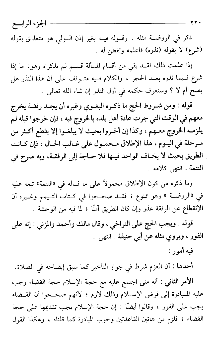 قوله: ومن شروط الحج ما ذكره البغوي وغيره أن يجد رفقة يخرج معهم في الوقت التي جرت عادة أهل بلده بالخروج فيه، فإن خرجوا قبله لم يلزمه الخروج معهم، وكذا إن أخروا بحيث لا يبلغوا إلا بقطع أكثر من مرحلة في اليوم، هذا الإطلاق محمول على غالب الحال، فإن كانت الطريق بحيث لا يخاف الواحد فيها فلا حاجة إلى الرفقة، وبه صرح في التتمة. انتهى كلامه.