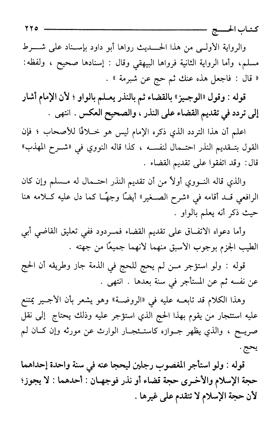 قوله: وقول "الوجيز" بالقضاء ثم بالنذر يعلم بالواو؛ لأن الإمام أشار إلى تردد في تقديم القضاء على النذر، والصحيح العكس. انتهى.