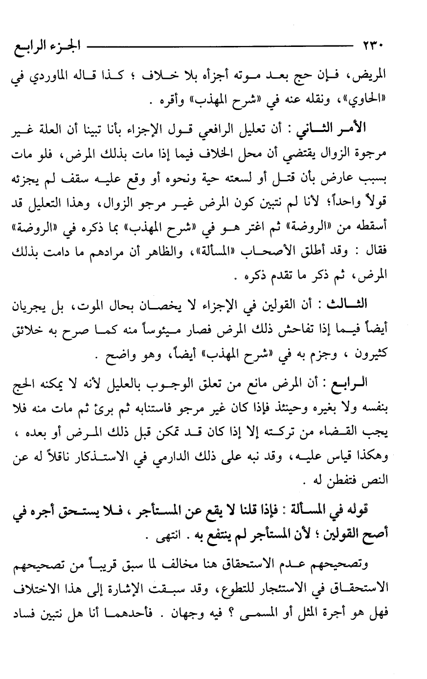 الرابع: أن المرض مانع من تعلق الوجوب بالعليل لأنه لا يمكنه الحج بنفسه ولا بغيره وحينئذ فإذا كان غير مرجو فاستنابه ثم برئ ثم مات منه فلا يجب القضاء من تركته إلا إذا كان قد تمكن قبل ذلك المرض أو بعده، وهكذا قياس عليه، وقد نبه على ذلك الدارمي في الاستذكار ناقلًا له عن النص فتفطن له.