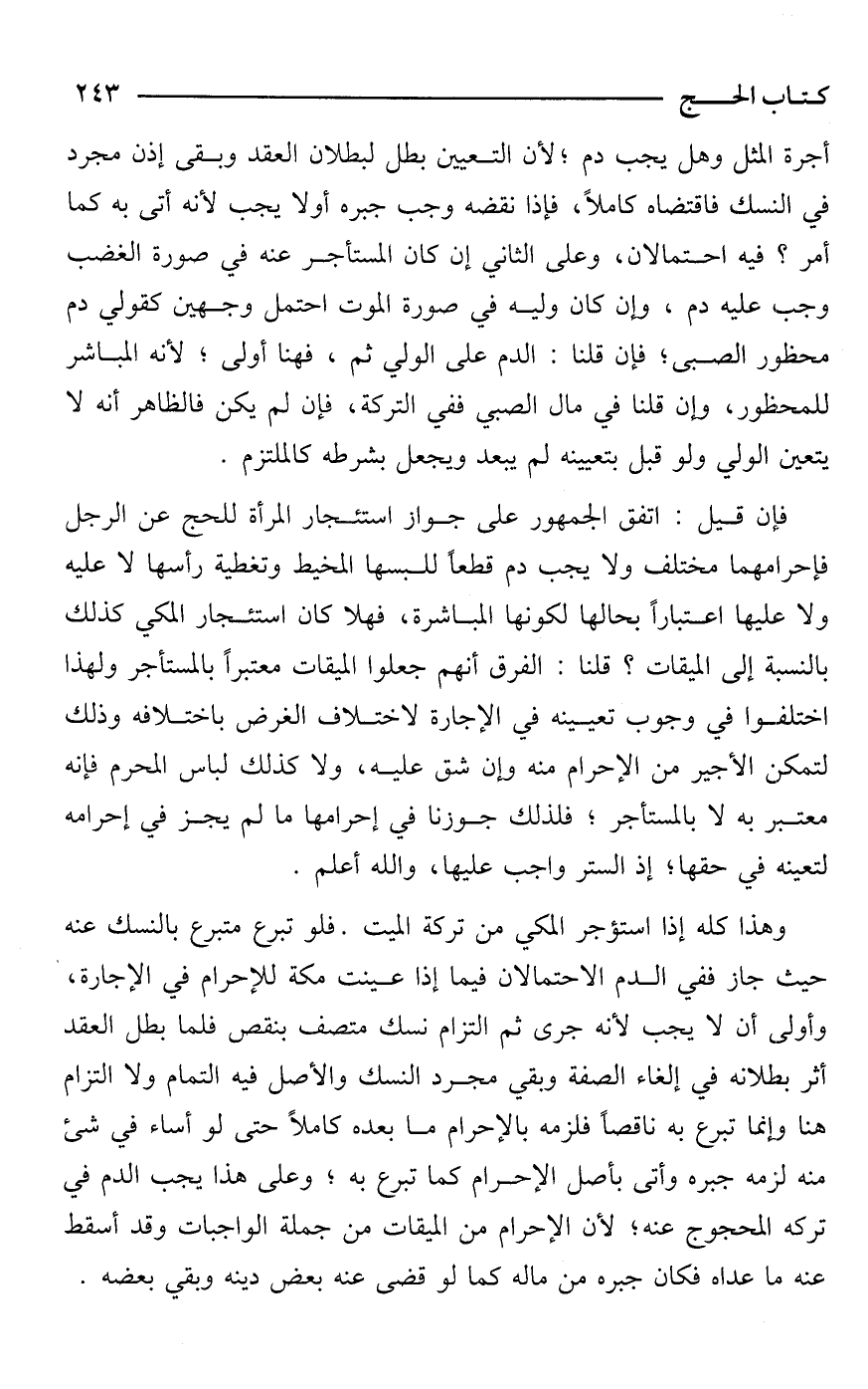 أجرة المثل وهل يجب دم؛ لأن التعيين بطل لبطلان العقد وبقى إذن مجرد في النسك فاقتضاه كاملًا، فإذا نقضه وجب جبره أو لا يجب لأنه أتى به كما أمر؟ فيه احتمالان، وعلى الثاني إن كان المستأجر عنه في صورة الغضب وجب عليه دم، وإن كان وليه في صورة الموت احتمل وجهين كقولي دم محظور الصبي؛ فإن قلنا: الدم على الولي ثم، فهنا أولى؛ لأنه المباشر للمحظور، وإن قلنا في مال الصبي ففي التركة، فإن لم يكن فالظاهر أنه لا يتعين الولي ولو قبل بتعيينه لم يبعد ويجعل بشرطه كالملتزم.