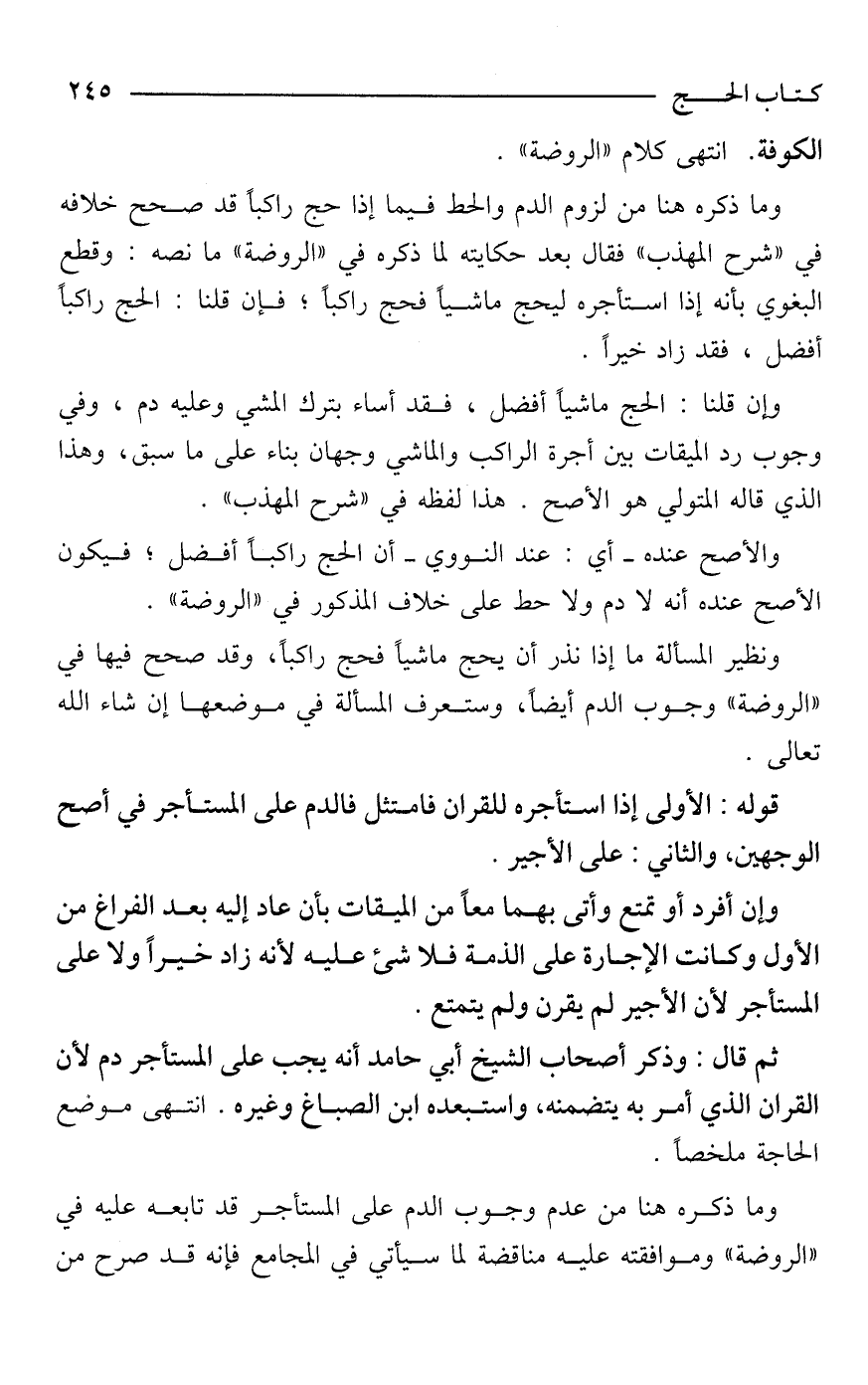 والأصح عنده -أي: عند النووي- أن الحج راكبًا أفضل؛ فيكون الأصح عنده أنه لا دم ولا حط على خلاف المذكور في "الروضة".
