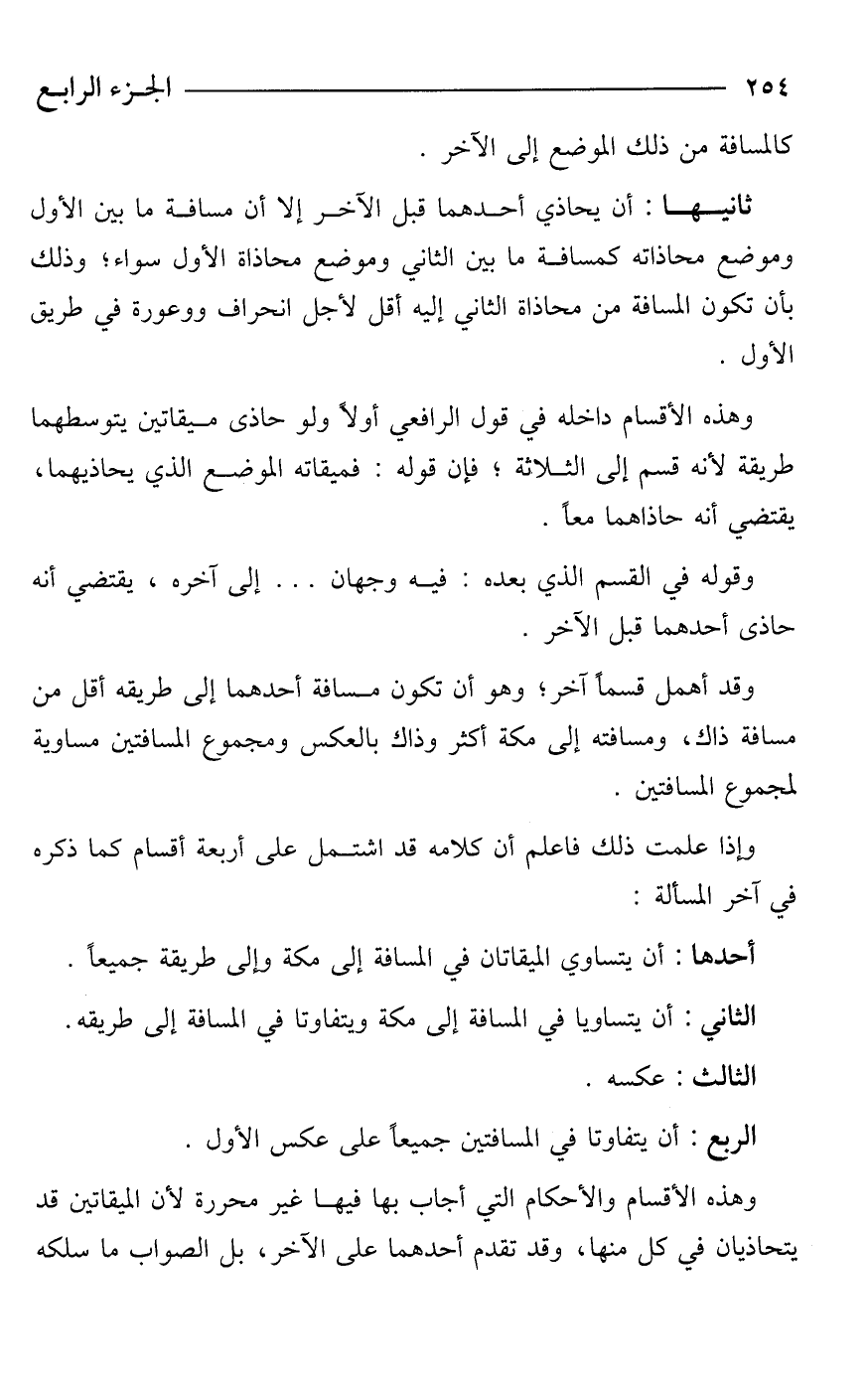 وقد أهمل قسمًا آخر؛ وهو أن تكون مسافة أحدهما إلى طريقه أقل من مسافة ذاك، ومسافته إلى مكة أكثر وذاك بالعكس ومجموع المسافتين مساوية لمجموع المسافتين.
