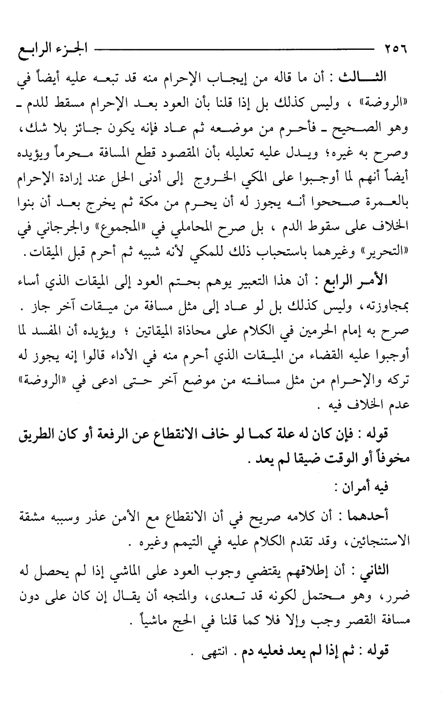 الثالث: أن ما قاله من إيجاب الإحرام منه قد تبعه عليه أيضًا في "الروضة"، وليس كذلك بل إذا قلنا بأن العود بعد الإحرام مسقط للدم -وهو الصحيح- فأحرم من موضعه ثم عاد فإنه يكون جائز بلا شك، وصرح به غيره؛ ويدل عليه تعليله بأن المقصود قطع المسافة محرمًا ويؤيده أيضًا أنهم لما أوجبوا على المكي الخروج إلى أدنى الحل عند إرادة الإحرام بالعمرة صححوا أنه يجوز له أن يحرم من مكة ثم يخرج بعد أن بنوا الخلاف على سقوط الدم، بل صرح المحاملي في "المجموع" والجرجاني في "التحرير" وغيرهما باستحباب ذلك للمكي لأنه شبيه ثم أحرم قبل الميقات.