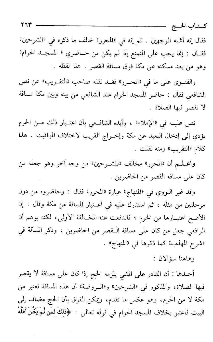 والفتوى على ما في "المحرر" فقد نقله صاحب "التقريب" عن نص الشافعي فقال: حاضر المسجد الحرام عند الشافعي من بينه وبين مكة مسافة لا تقصر فيها الصلاة.