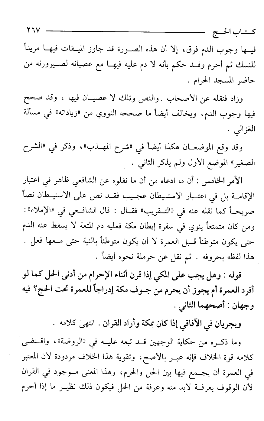 الأمر الخامس: أن ما ادعاه من أن ما نقلوه عن الشافعي ظاهر في اعتبار الإقامة بل في اعتبار الاستيطان عجيب فقد نص على الاستيطان نصًا صريحًا كما نقله عنه في "التقريب" فقال: قال الشافعي في "الإملاء": ومن كان متمتعًا ينوي في سفرة إيطان مكة فعليه دم المتعة لا يسقط عنه الدم حتى يكون متوطنًا قبل العمرة لا أن يكون متوطنًا بالنية حتى معها فعل. هذا لفظه بحروفه. ثم نقل عن حرملة نحوه أيضًا.