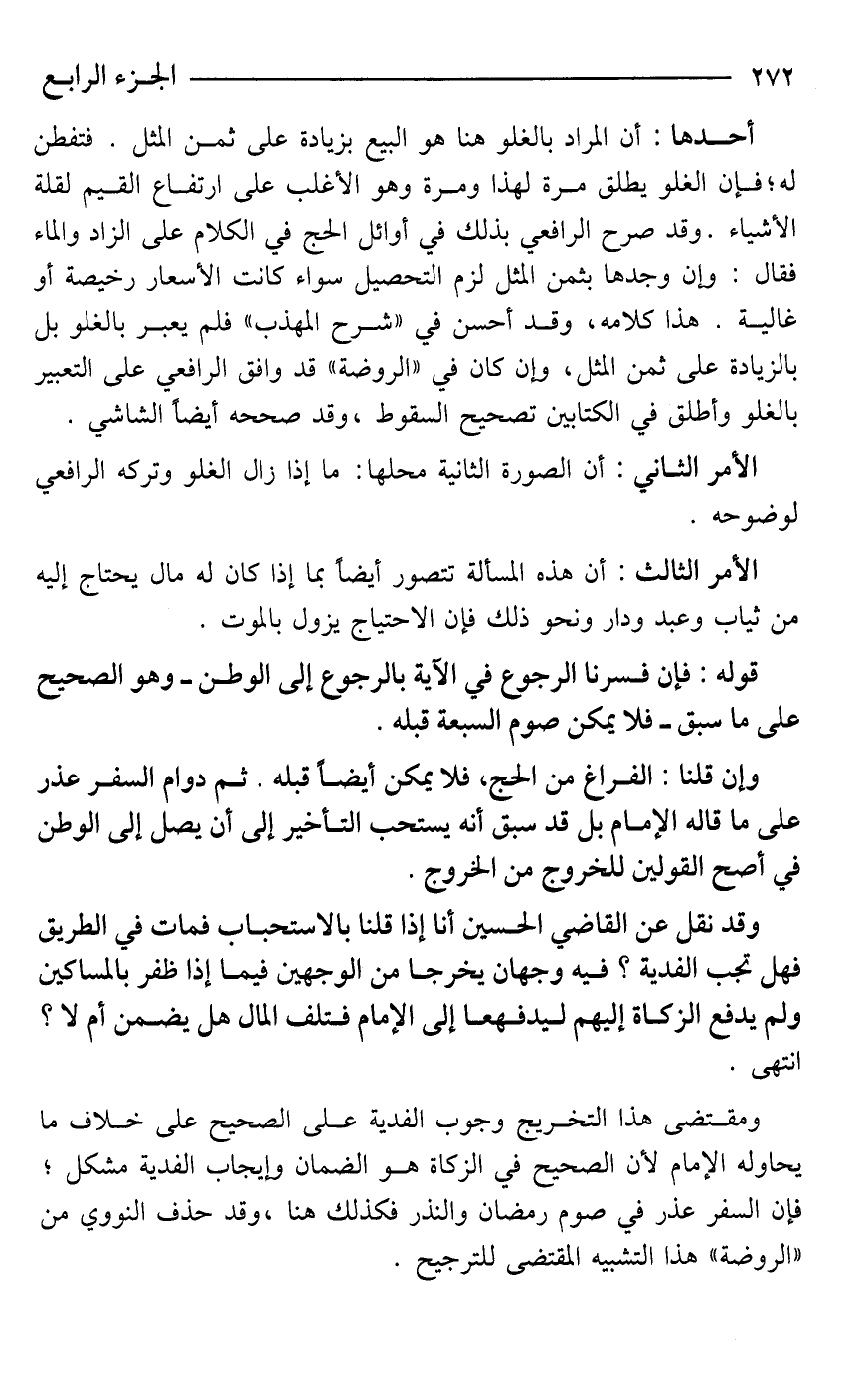 أحدها: أن المراد بالغلو هنا هو البيع بزيادة على ثمن المثل. فتفطن له؛ فإن الغلو يطلق مرة لهذا ومرة وهو الأغلب على ارتفاع القيم لقلة الأشياء. وقد صرح الرافعي بذلك في أوائل الحج في الكلام على الزاد والماء فقال: وإن وجدها بثمن المثل لزم التحصيل سواء كانت الأسعار رخيصة أو غالية. هذا كلامه، وقد أحسن في "شرح المهذب" فلم يعبر بالغلو بل بالزيادة على ثمن المثل، وإن كان في "الروضة" قد وافق الرافعي على التعبير بالغلو وأطلق في الكتابين تصحيح السقوط، وقد صححه أيضًا الشاشي.