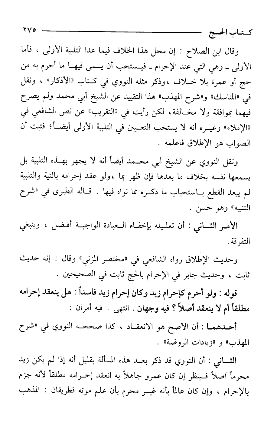 وقال ابن الصلاح: إن محل هذا الخلاف فيما عدا التلبية الأولى، فأما الأولى -وهي التي عند الإحرام- فيستحب أن يسمى فيها ما أحرم به من حج أو عمرة بلا خلاف، وذكر مثله النووي في كتاب "الأذكار"، ونقل في "المناسك" و"شرح المهذب" هذا التقييد عن الشيخ أبي محمد ولم يصرح فيهما بموافقة ولا مخالفة، لكن رأيت في "التقريب" عن نص الشافعي في "الإملاء" وغيره أنه لا يستحب التعيين في التلبية الأولى أيضًا؛ فثبت أن الصواب هو الإطلاق فاعلمه.