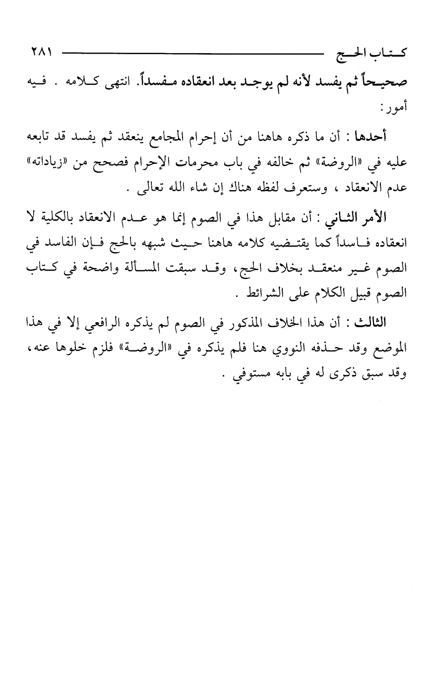 الأمر الثاني: أن مقابل هذا في الصوم إنما هو عدم الانعقاد بالكلية لا انعقاده فاسدًا كما يقتضيه كلامه هاهنا حيث شبهه بالحج فإن الفاسد في الصوم غير منعقد بخلاف الحج، وقد سبقت المسألة واضحة في كتاب الصوم قبيل الكلام على الشرائط.