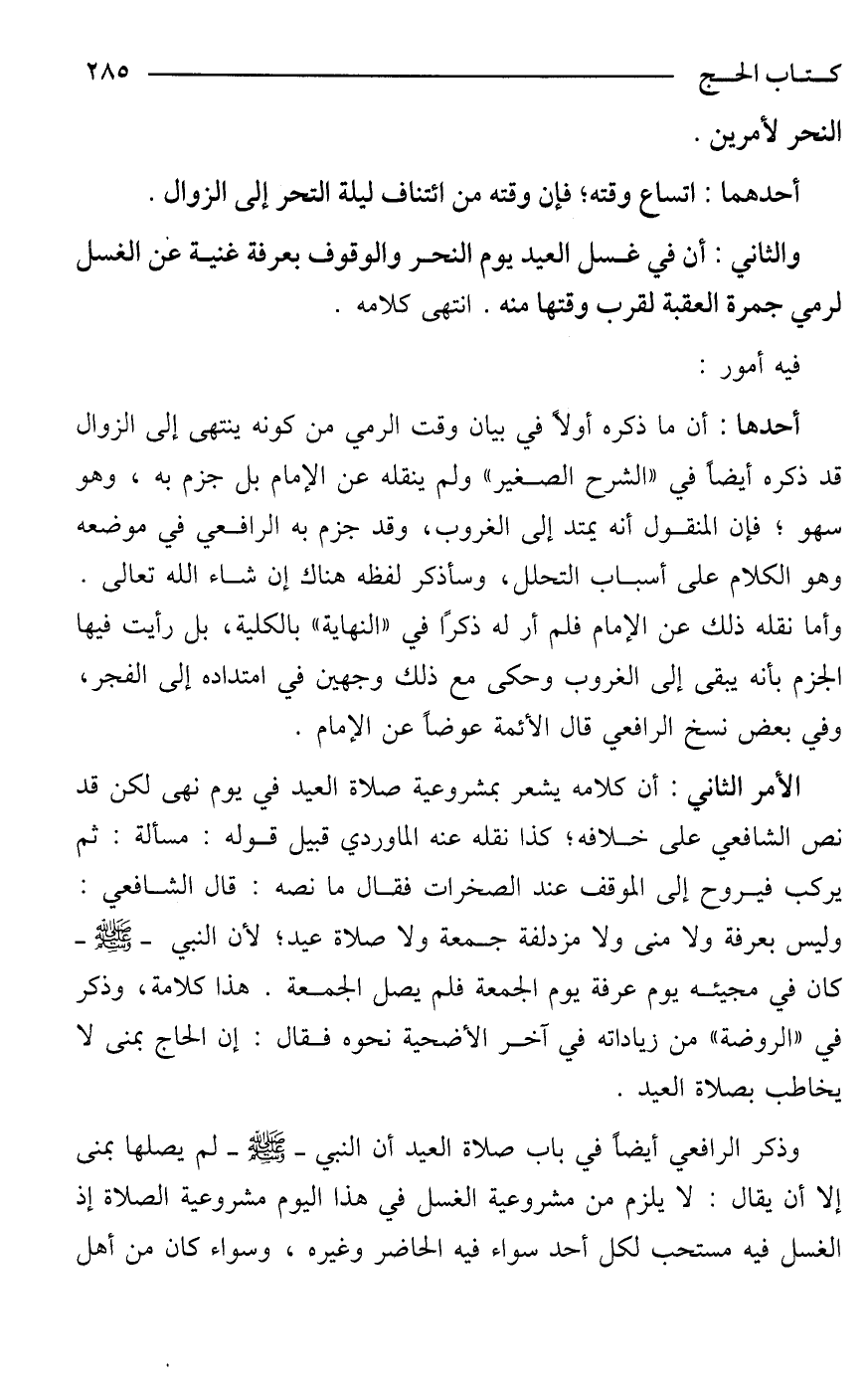 وذكر الرافعي أيضًا في باب صلاة العيد أن النبي - صَلَّى اللَّهُ عَلَيْهِ وَسَلَّمَ - لم يصلها بمنى إلا أن يقال: لا يلزم من مشروعية الغسل في هذا اليوم مشروعية الصلاة إذ الغسل فيه مستحب لكل أحد سواء فيه الحاضر وغيره، وسواء كان من أهل