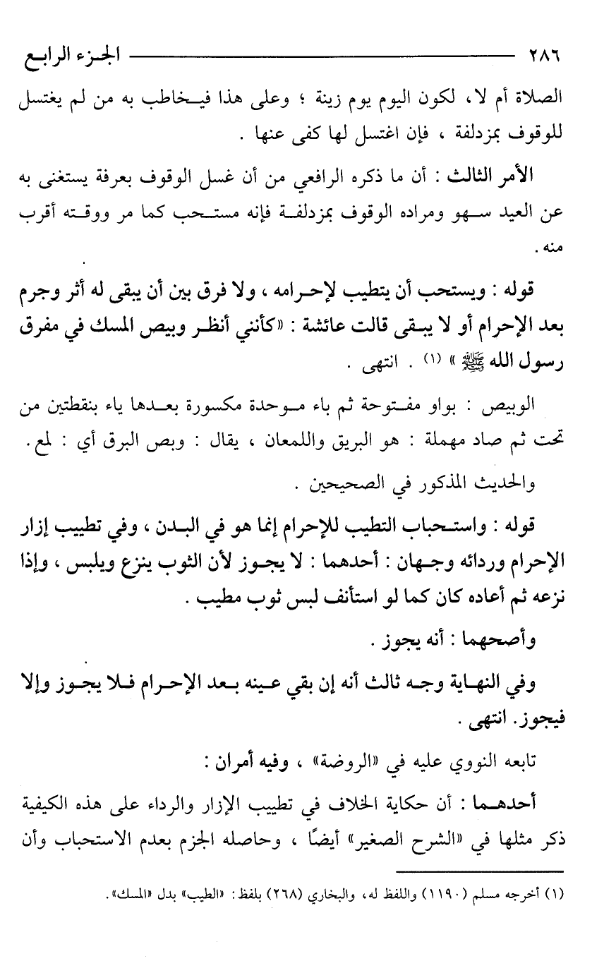 قوله: ويستحب أن يتطيب لإحرامه، ولا فرق بين أن يبقى له أثر وجرم بعد الإحرام أو لا يبقى قالت عائشة: "كأنني أنظر وبيص المسك في مفرق رسول الله - صَلَّى اللَّهُ عَلَيْهِ وَسَلَّمَ - (¬1). انتهى.