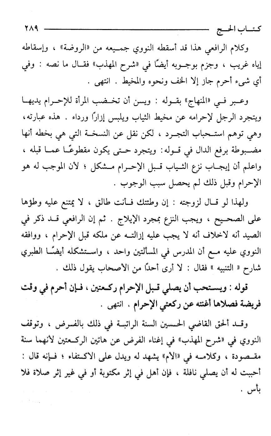 وكلام الرافعي هذا قد أسقطه النووي جميعه من "الروضة"، وإسقاطه إياه غريب، وجزم بوجوبه أيضًا في "شرح المهذب" فقال ما نصه: وفي أي شيء أحرم جاز إلا الخف ونحوه والمخيط. انتهى.