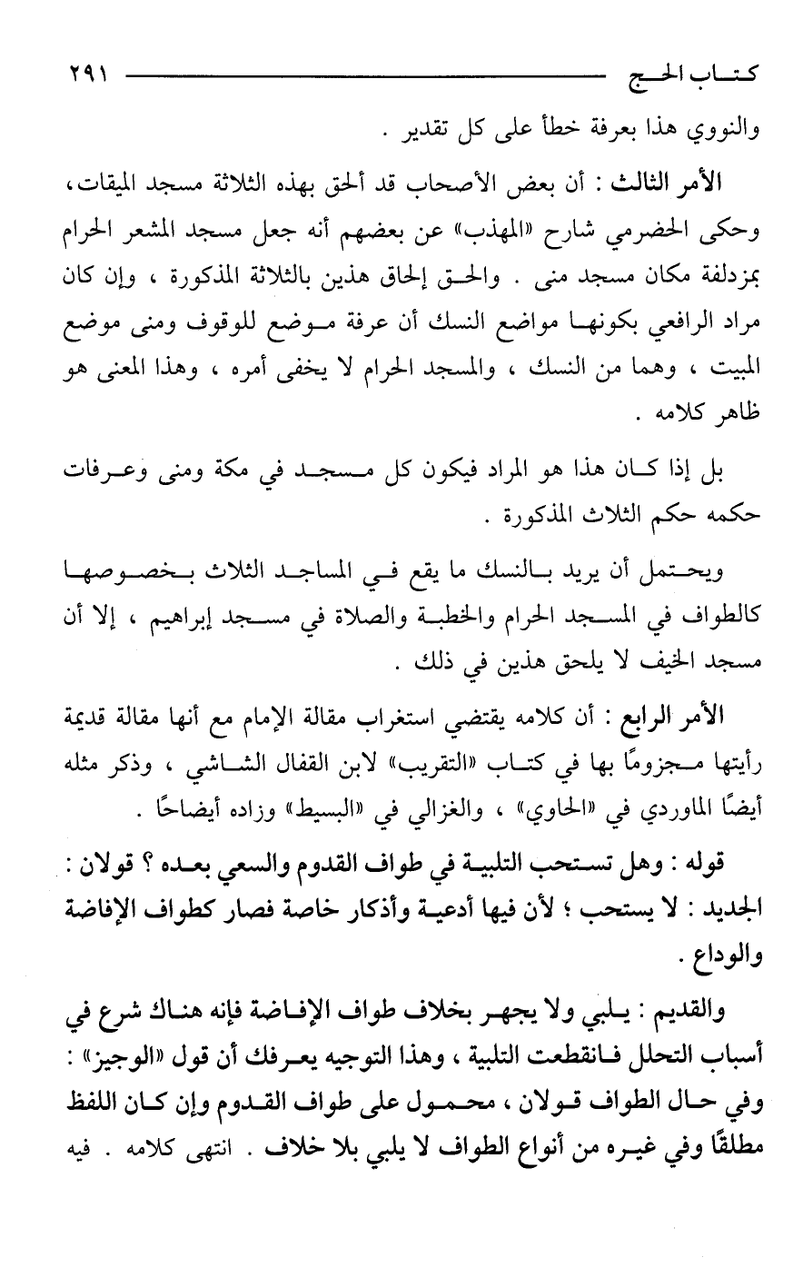 الأمر الثالث: أن بعض الأصحاب قد ألحق بهذه الثلاثة مسجد الميقات، وحكى الحضرمي شارح "المهذب" عن بعضهم أنه جعل مسجد المشعر الحرام بمزدلفة مكان مسجد منى. والحق إلحاق هذين بالثلاثة المذكورة، وإن كان مراد الرافعي بكونها مواضع النسك أن عرفة موضع للوقوف ومنى موضع المبيت، وهما من النسك، والمسجد الحرام لا يخفى أمره، وهذا المعنى هو ظاهر كلامه.