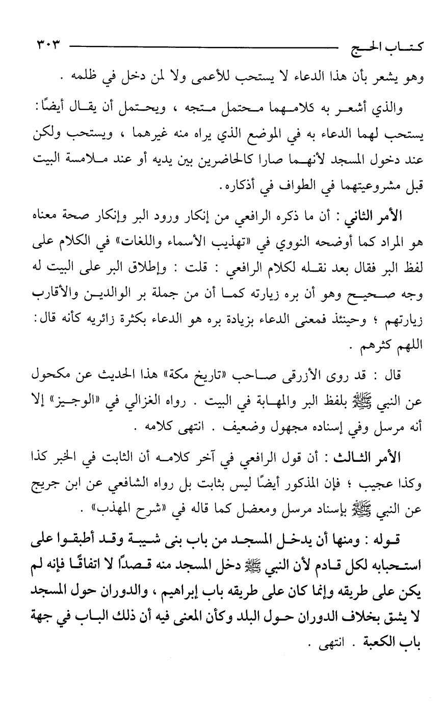 الأمر الثاني: أن ما ذكره الرافعي من إنكار ورود البر وإنكار صحة معناه هو المراد كما أوضحه النووي في "تهذيب الأسماء واللغات" في الكلام على لفظ البر فقال بعد نقله لكلام الرافعي: قلت: وإطلاق البر على البيت له وجه صحيح وهو أن بره زيارته كما أن من جملة بر الوالدين والأقارب زيارتهم؛ وحينئذ فمعنى الدعاء بزيادة بره هو الدعاء بكثرة زائريه كأنه قال: اللهم كثرهم.