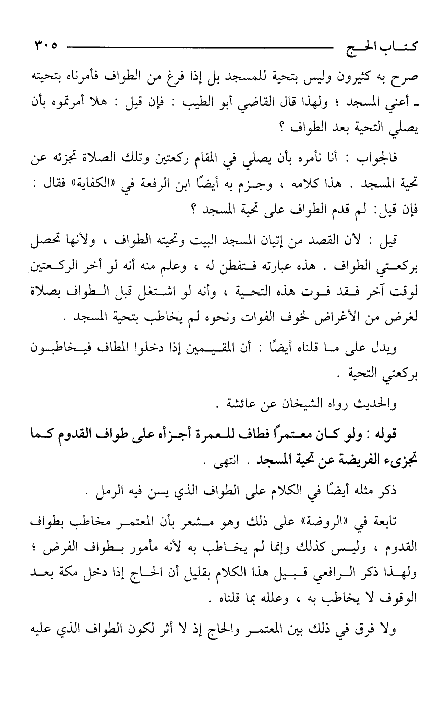 فالجواب: أنا نأمره بأن يصلي في المقام ركعتين وتلك الصلاة تجزئه عن تحية المسجد. هذا كلامه، وجزم به أيضًا ابن الرفعة في "الكفاية" فقال: فإن قيل: لم قدم الطواف على تحية المسجد؟