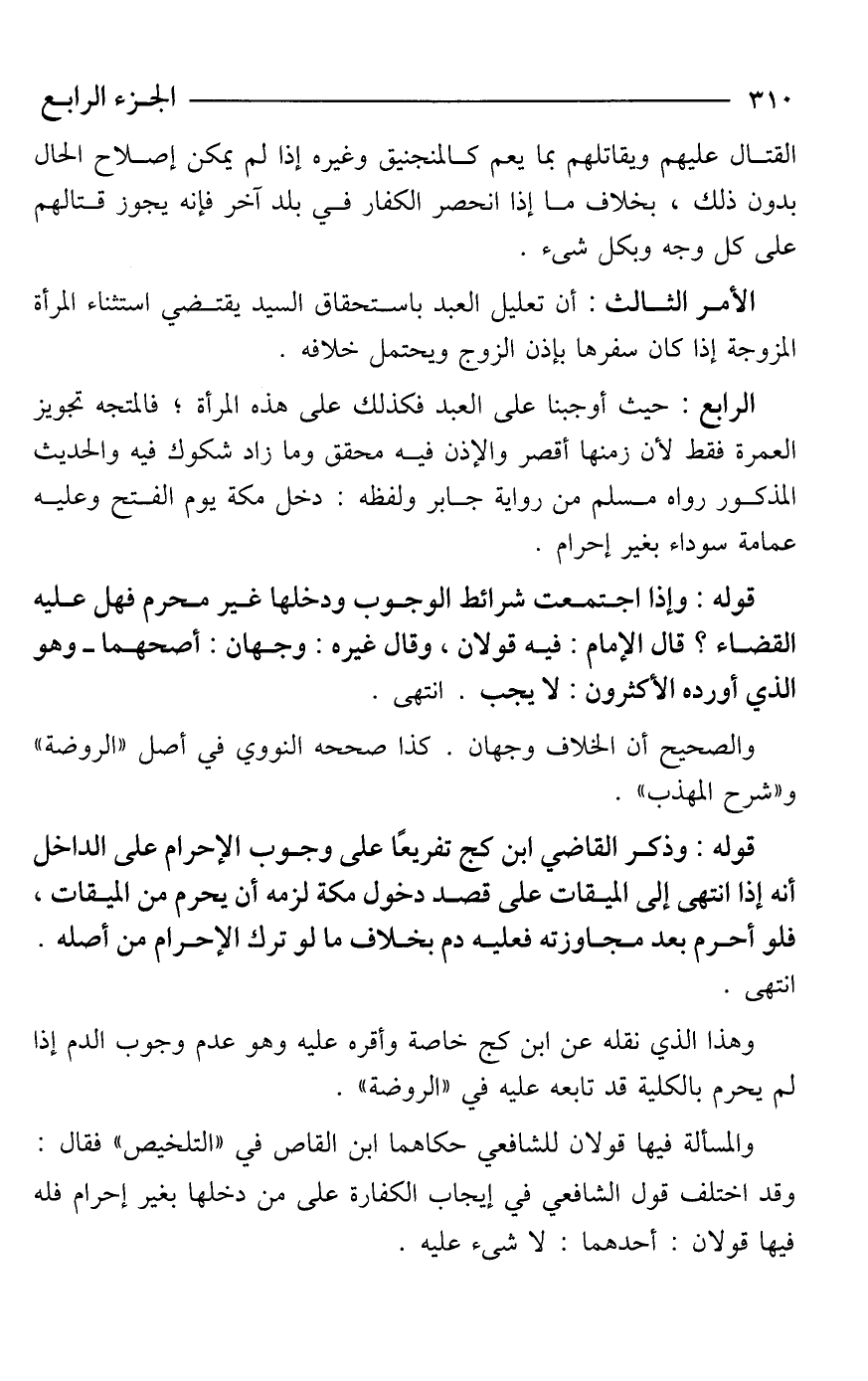 الرابع: حيث أوجبنا على العبد فكذلك على هذه المرأة؛ فالمتجه تجويز العمرة فقط لأن زمنها أقصر والإذن فيه محقق وما زاد شكوك فيه والحديث المذكور رواه مسلم من رواية جابر ولفظه: دخل مكة يوم الفتح وعليه عمامة سوداء بغير إحرام.